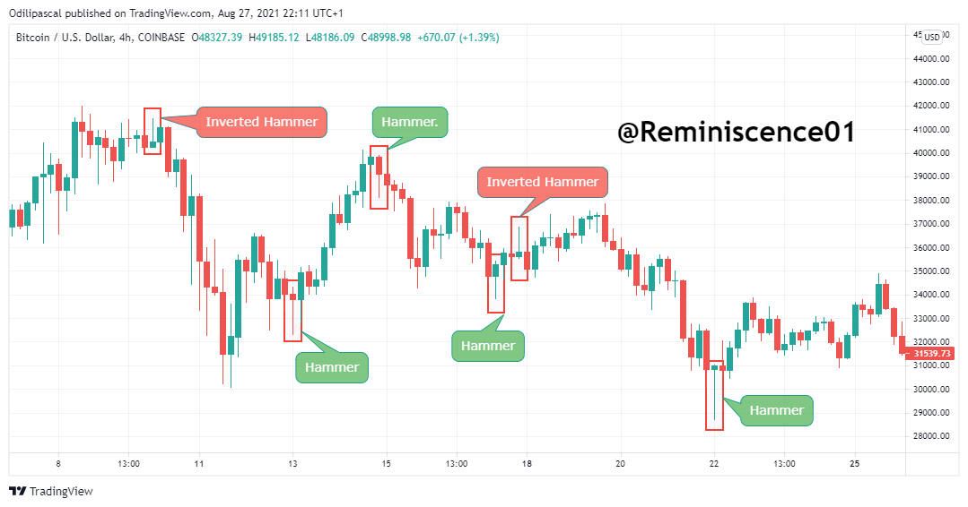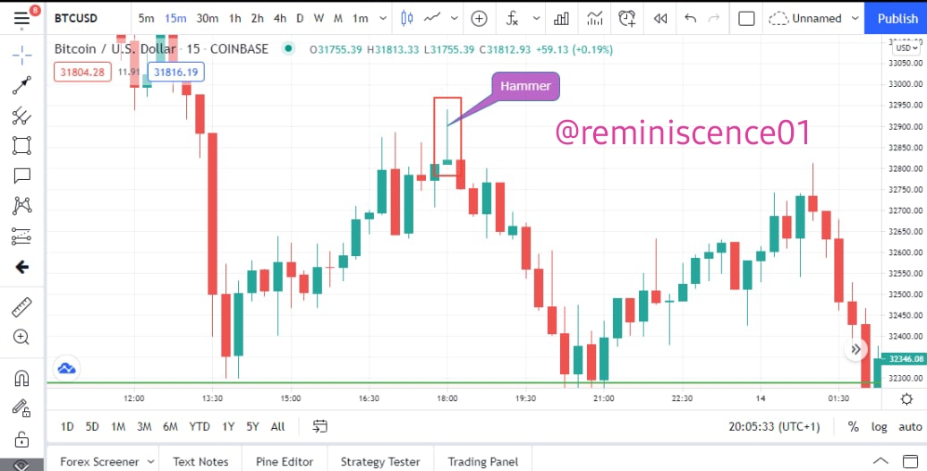 From the image above, we can see a long tail formed which shows that at the beginning of this candle, sellers pushed price down. But after some time, buyers came in and took control of price by closing above the open of the candle. This is a strong reversal pattern when they appear in a trending market especially at a support level. Example of the hammer on the chart.