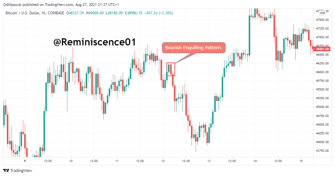 From the anatomy of the candlestick we discussed above, the bearish engulfing candle has a close below the open of the previous candle. This is how the bearish engulfing candle looks like in the chart.