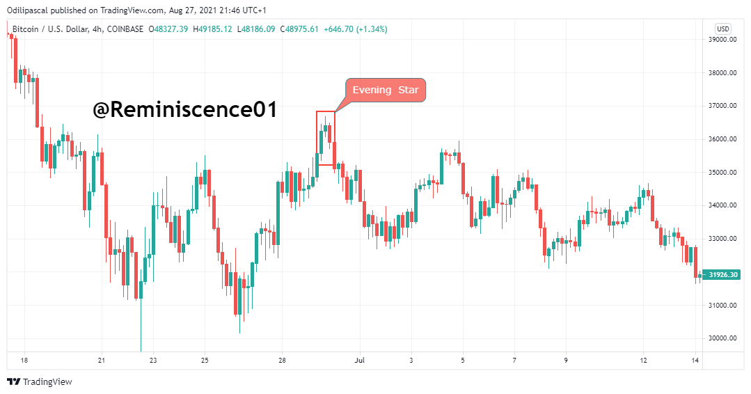 The psychology behind the evening star is that buyers were in control of price until sellers took over control from the buyers. The evening star is a strong bearish reversal pattern especially when it is formed at a resistance level. Example of an evening star on the chart.