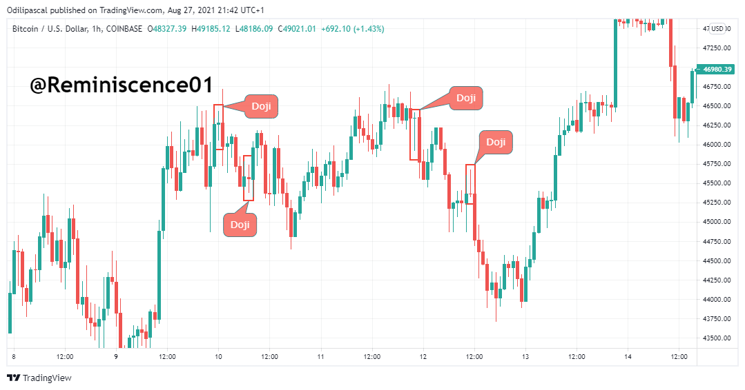 The Doji candles simply indicate that buyers are unable to push price higher and sellers are also unable to push lower, this bringing price back to the opening price. Let's take a look at the Doji candlesticks on the chart.