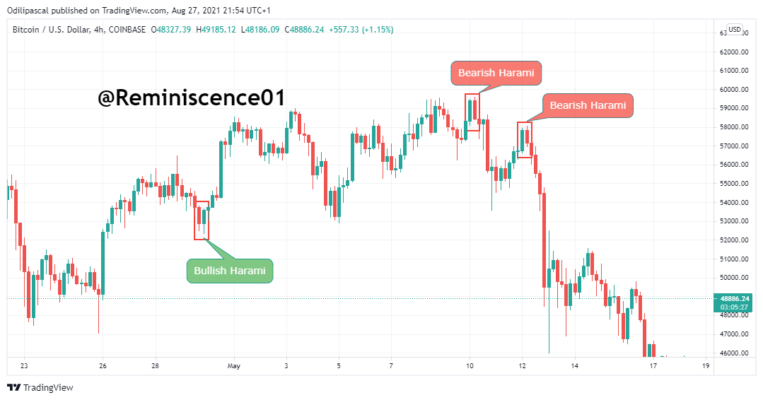 Traders look out for the Harami candlestick pattern at the top or bottom of a trend for price reversal. The bullish harami is a strong bullish reversal especially when it is formed a major support area. Similarly, the bearish harami is a strong bearish reversal candlestick pattern especially when it occurs at a major resistance level. Example of the Harami candlestick pattern on the chart. The Harami candlestick pattern can also serve as a continuation when it appears in the middle of a trend.