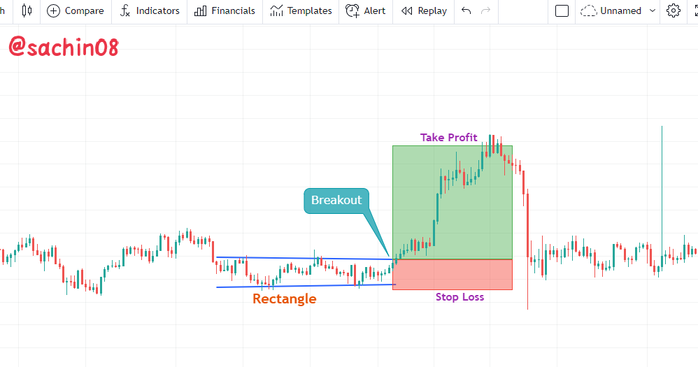 From the above image, We can see that a rectangle is formed which is touching each trendline two times and when it breaks the Resistance line, the Point becomes our entry point. At the time of Breakout, We can take our entry and then We can mark Take Profit level and Stop loss level just below the Support line.