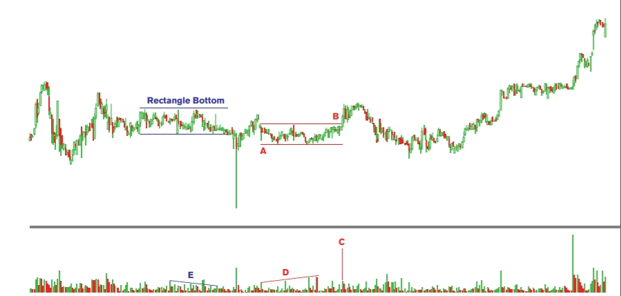 Notice the Volume trend. Just before the breakout, Volume makes a low level. Many times Volume will fall off dramatically a day or two before the breakout of most chart patterns (not just rectangles).