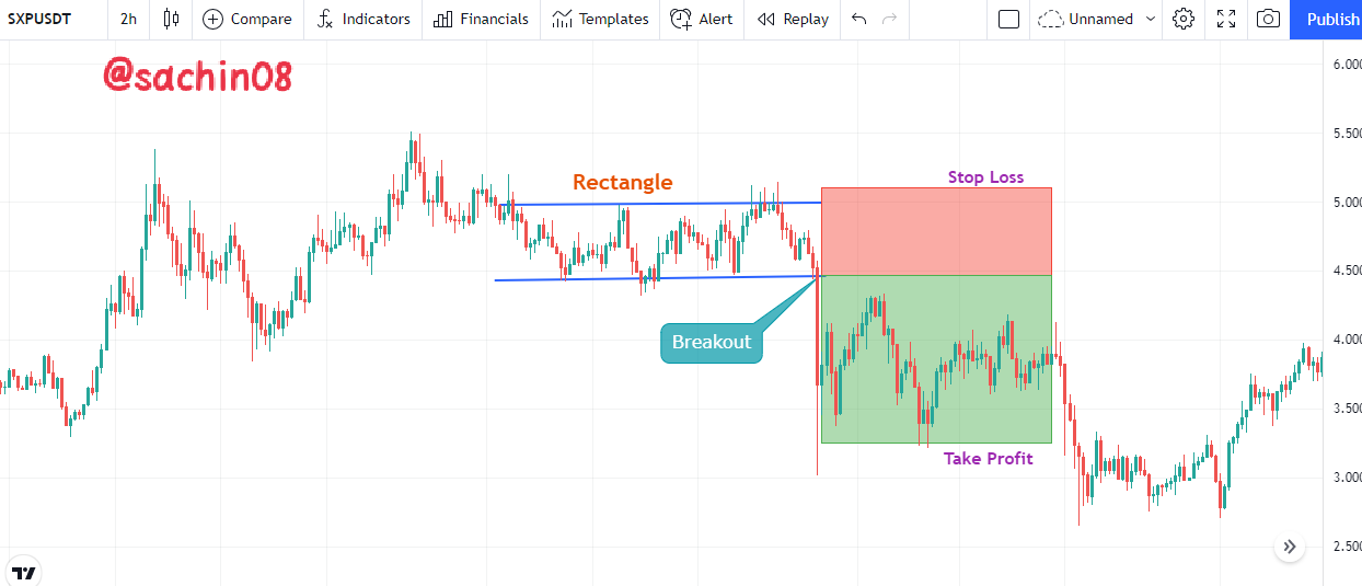 From the above image, We can see that a rectangle is formed which is touching each trendline three times and when it breaks the Support line, the Point becomes our entry point for short or We can sell our asset at that point. At the time of Breakout, We can take our entry and then We can mark Take Profit level and Stop loss level just above the resistance line.