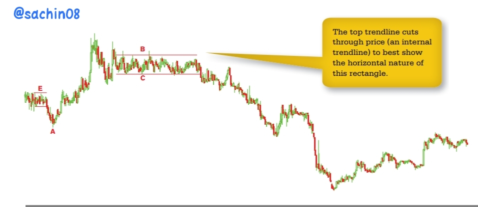 Connect the minor highs with a horizontal or flat trendline on the top and bottom. A same trendline drawn below the minor lows which forms a parallel trendline. There should be atleast two touches of each trendline are required for a valid rectangle. The touches need not alternate from top to bottom, but should have atleast two clearly defined minor highs and two minor lows coming close to or touching each trendline.