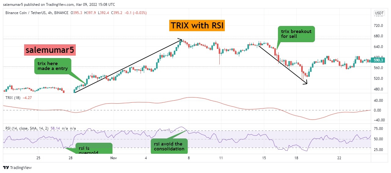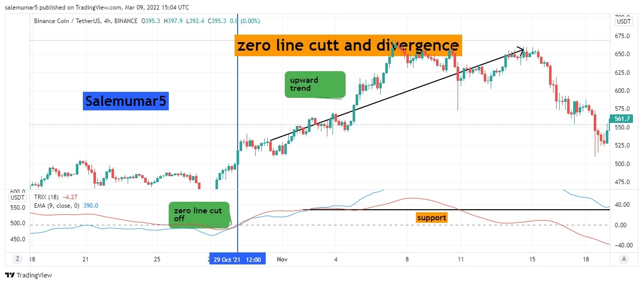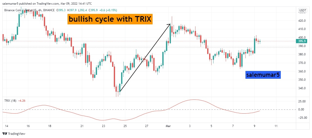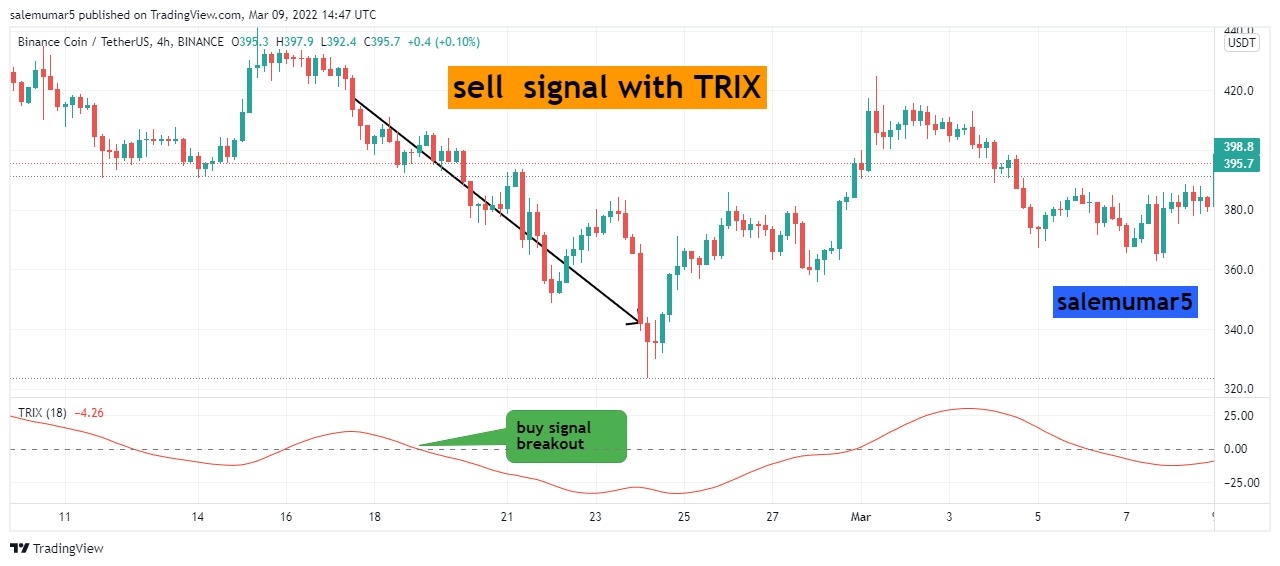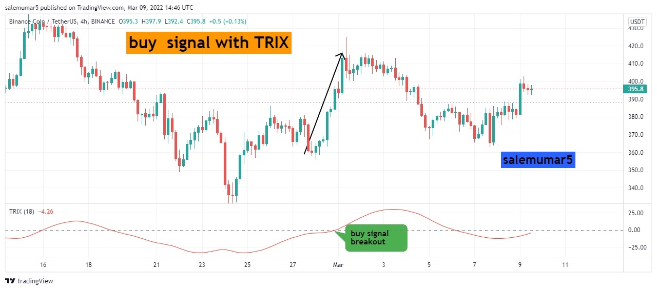 Here the chart below you can see the BNB/USDT with 4hrs chart its mainly attract the trix because time frame is large, though you can see the point where i enlightened the call out where the breakout and cross over has been occured from bottom to top and price continuously move upward and do maintain your trade with 1:4 will provide you good results.
