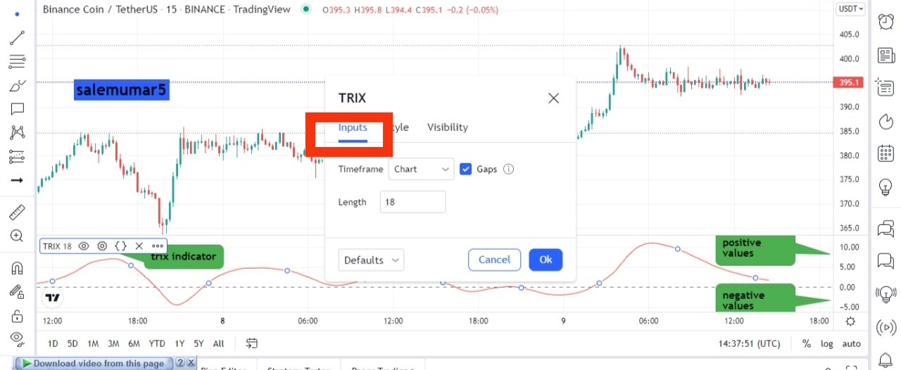 - Here you can see below the input option where we told you that we will run the default setting time frame will be run according to chart and length us 18 while the gaps are should be enabled