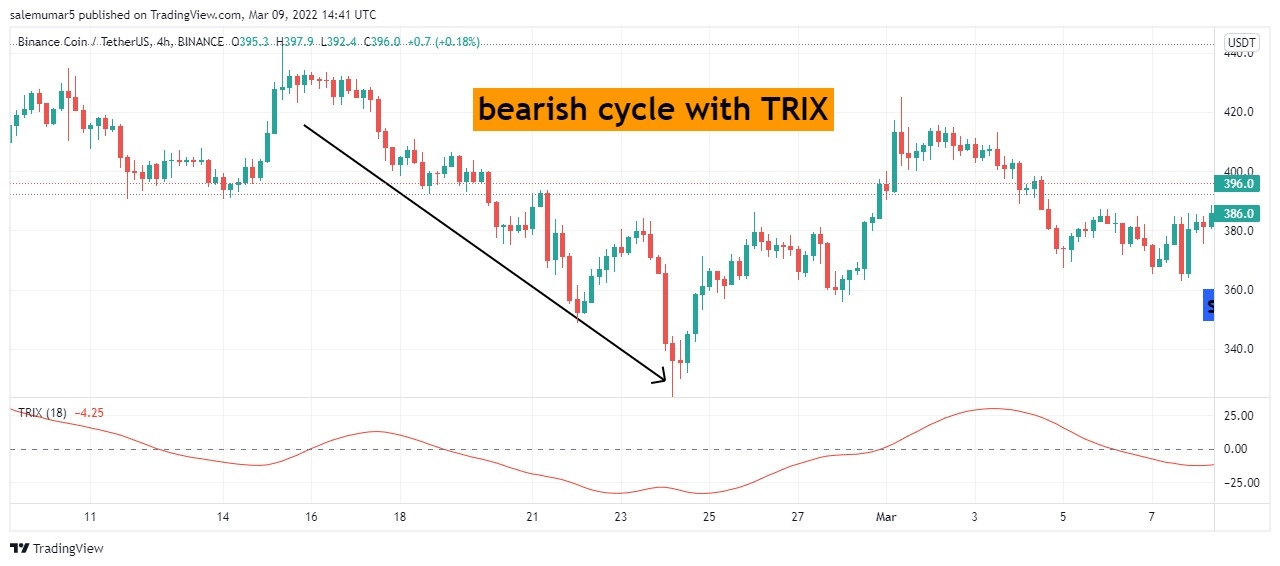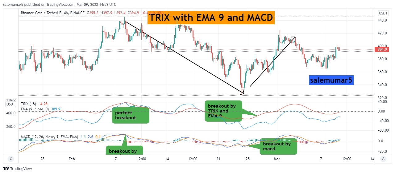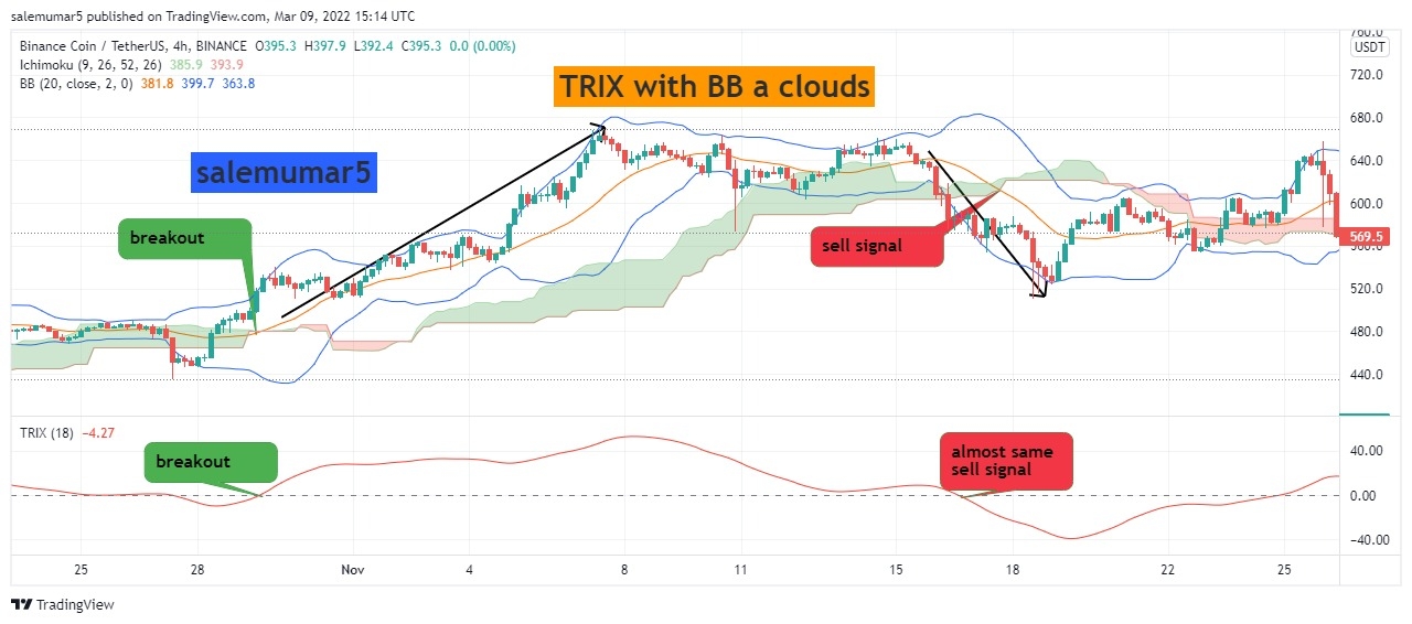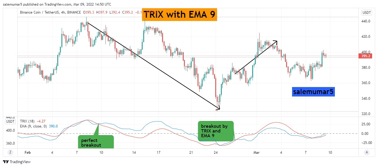 Here the chart below you can see the BNB/USDT with 4hrs chart its mainly attract the trix because time frame is large, though you can see the point where i enlightened the call out where the breakout and cross over has been occured from top to bottom and price continuously move downward and do maintain your trade with 1:4 will provide you good results.