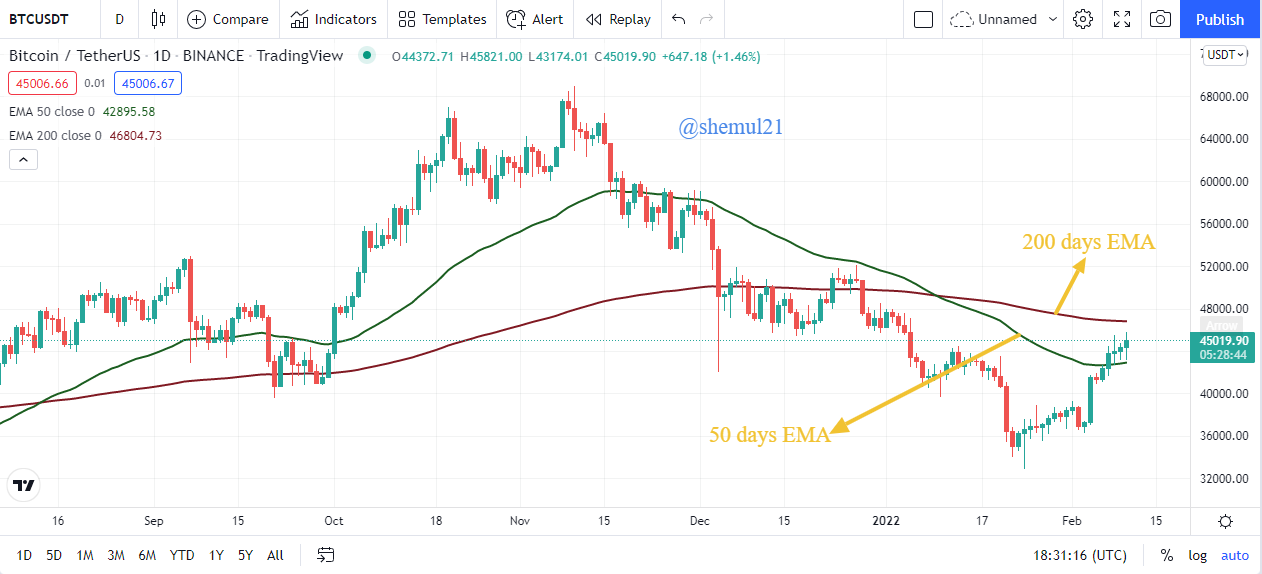 To demonstrate the MA crossover system, we will use a bitcoin price chart with 50 ema and 200 ema as the moving averages.