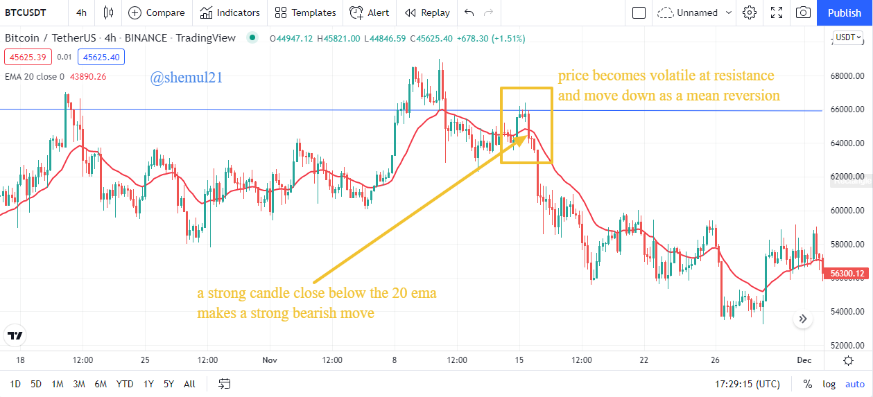 Image Source Tradingview The above screenshot shows a horizontal resistance level where the price increases by widening the gap between the price and the dynamic 20-day exponential moving average (EMA). Later on, the price begins to fluctuate and eventually moves downward as a result of mean reversion. Furthermore, a bearish candle that closes below the 20 EMA pushes the price lower, resulting in significant bearish pressure.