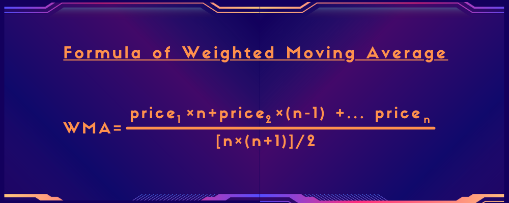 Image designed in Canva | by @shemul21 Weighted Moving Average(WMA): The Weighted Moving Average (WMA) is a statistical measure that gives greater weight to the most recent prices (data points) and less weight to the previous data. The WMA multiplies the price of each bar by a weighting factor in order to concentrate on the most recent data. Eventually, the sum of the weights will equal one, or one hundred percent. The WMA algorithm is supposed to be more descriptive when it comes to the frequency of concurrency when compared to the SMA algorithm. The fact is that all the numbers on the SMA are given equal importance. The formula of the Weighted Moving Average is given below: