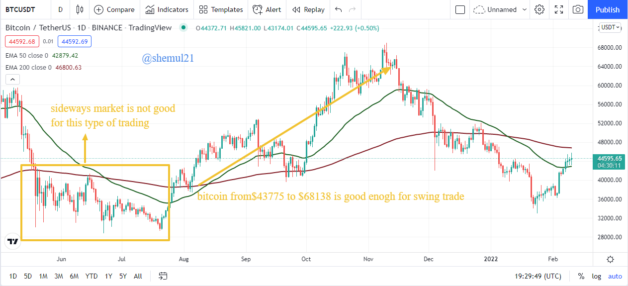Image Source Tradingview We can see, the green 50 day EMA line is pretty close to the current market price (because it reacts more quickly) than the red 200 days EMA line (because it reacts slower). Traders have been using the crossover system in order to smooth out the entry and exit points. The trader receives significantly fewer signals as a result of this process, but the probability of the trade being profitable is quite high.