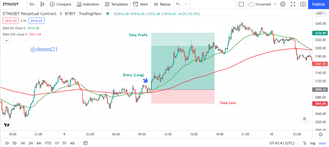 Here is an illustration of a buy and sell signal for an intraday trader in a 5min chart of ETH/USDT.