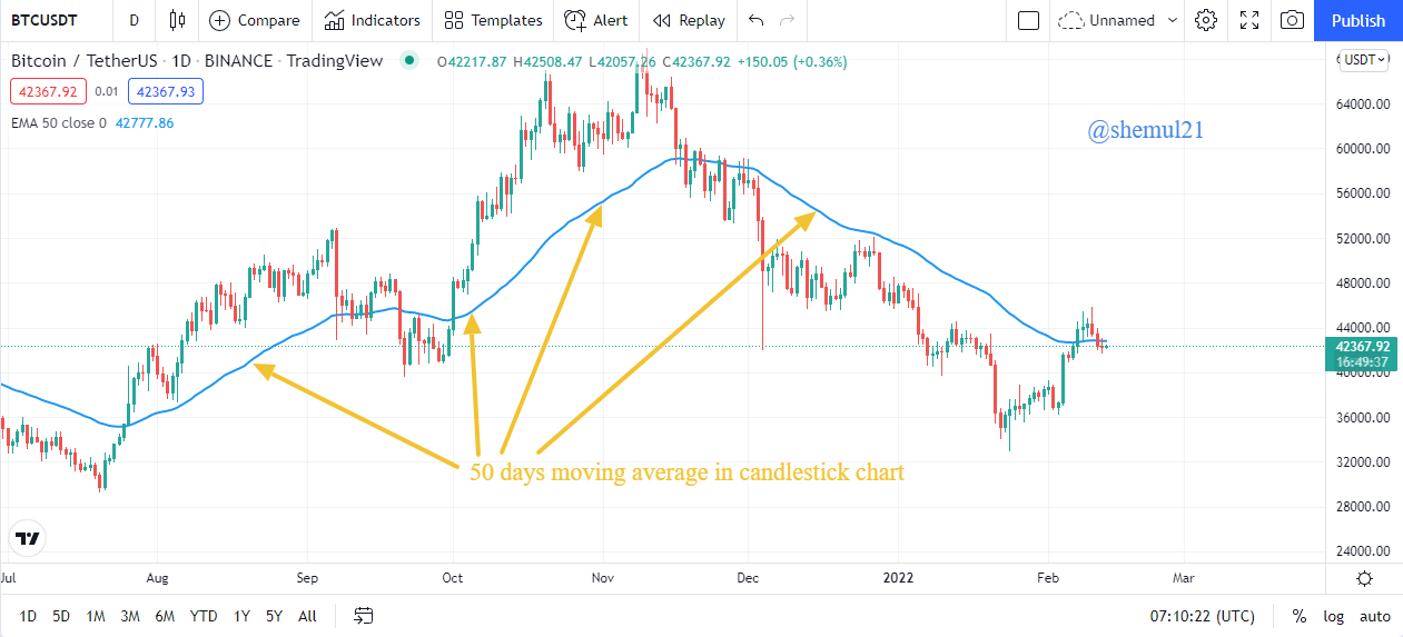 For example, if any crypto asset's price is above the 50-day moving average, it indicates that buyers are more active than sellers in the market. In this situation, if you want to trade on this crypto asset then you can consider it as a buying opportunity. In a candlestick chart, The moving average is represented with the price in the form of a dynamic line that changes position over time. Making trades with moving averages necessitates a deep understanding of the indicator, particularly its calculation method.