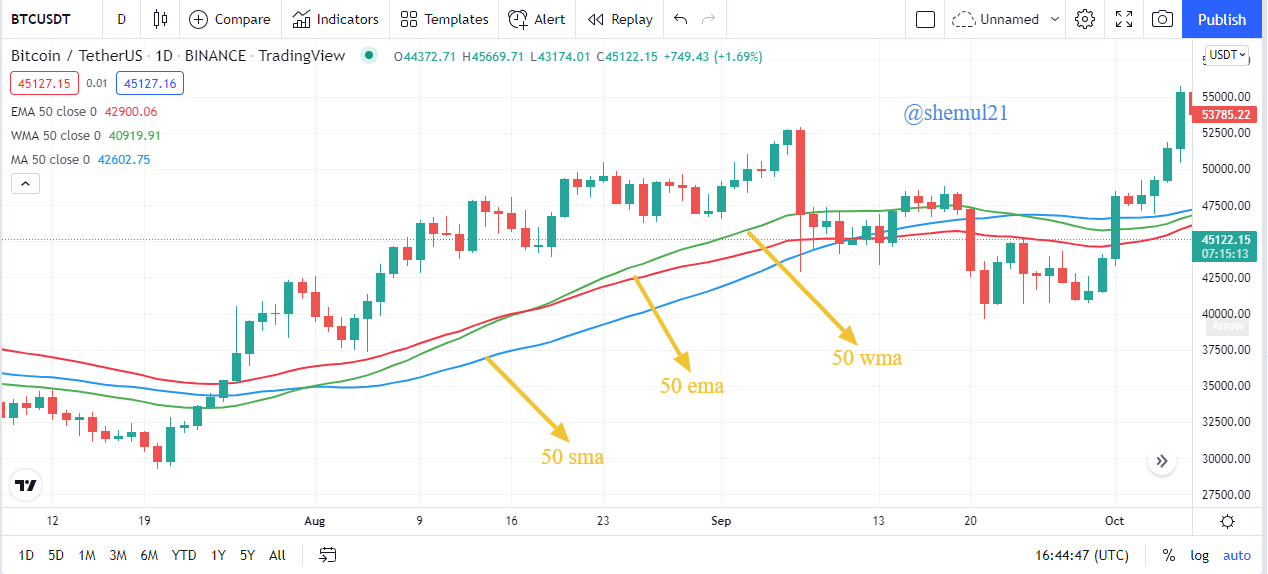 Not only moving average is the most widely utilized indicator in the world, but it is also available for free on the majority of trading platforms. Furthermore, by changing the timeframe and numerical method, you can combine multiple MAs into a single one. Let's plot the 50-day exponential moving average, the 50-day simple moving average, and the 50-day Weighted moving average together on a Bitcoin chart and compare them: