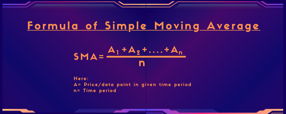 Simple Moving Average(SMA): The simple moving average (SMA) is a method for calculating the average price of a cryptocurrency for a set of data. The basic moving average only displays the average price, whereas the simple moving average displays all of the data as a dynamic line. The simple moving average takes all prices into consideration equally, enables investors to determine the true average price. Furthermore, the SMA indicator shifts its position whenever a new candle appears. The formula of the simple moving average is given below: