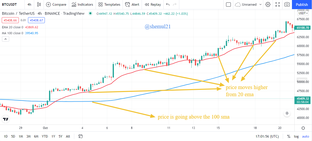 Image Source Tradingview The above screenshot shows that there is a clear uptrend in which the price is trading above the 100 SMA, indicating that long-term buyers are actively participating in the market. The price, on the other hand, is below the dynamic 20 EMA, which means that every bearish rejection from the 20 EMA pushes the price higher in the meantime. The 20 EMA represents the activity of short-term traders in this case, and in a bullish trend, every rejection from the 20 EMA indicates a potential buying point in the future.