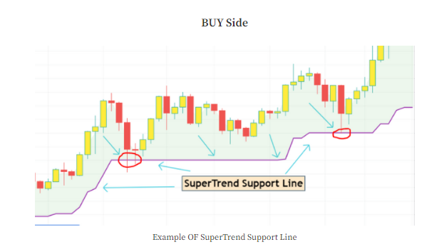 as I said when SuperTrend Line is below the current price, then wait till the price comes down to near the SuperTrend line, you can place the buy side somewhere near to that line. SuperTrend line has strong support and it has the capacity to take the price back to the previous high in a short time.