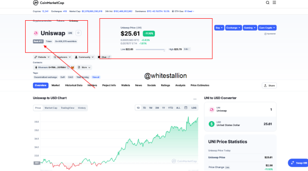 Uniswap is ranked 12th according to CoinMarketCap. Today 1st October 2021 the live trade price is $25.61. Its 24 hours trading volume also is $663,473,528. As of the last 24hours before writing this assignment Uniswap was up 11.29%. The coin’s circulating supply is 611,643,724 coins and the max supply of about 1,000,000,000 coins. It is available on platforms such as Huobi, Binance, etc.