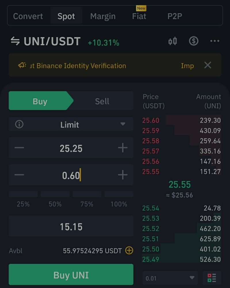 In order to purchase at least a 15$ equivalent of UNI, i made sure my account had more than $15