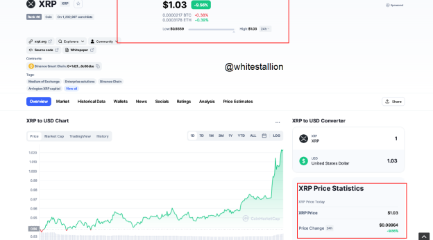 Throughout this week, XRP has been on a bull run, it has risen by about 2% in the last 7 days and by 9% in the last 24 hours thus, the current price is now $1.03 and the market is still bullish