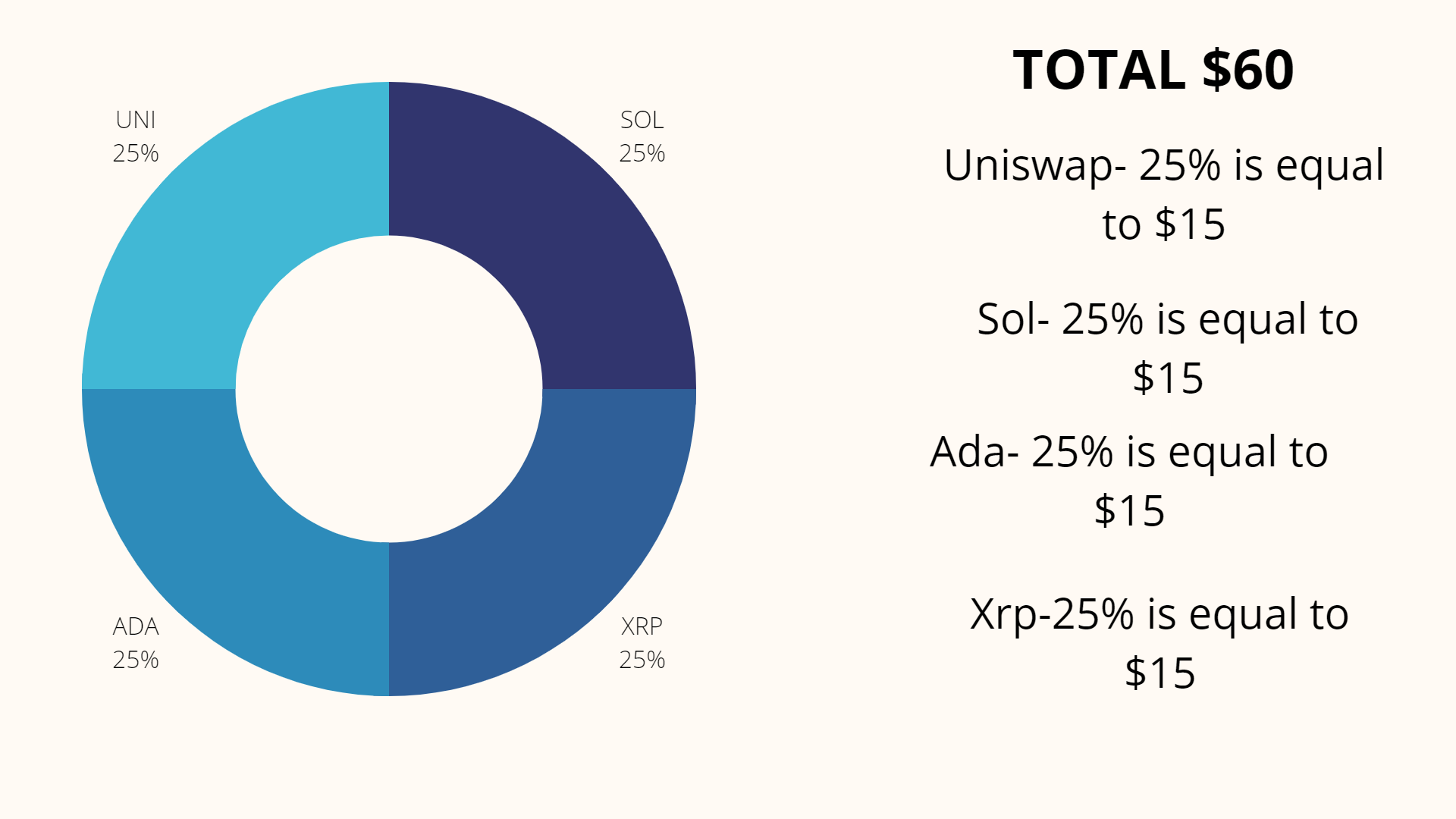 To proceed, I will be investing $60 as the Professor instructed into 4 different assets, $15 each: