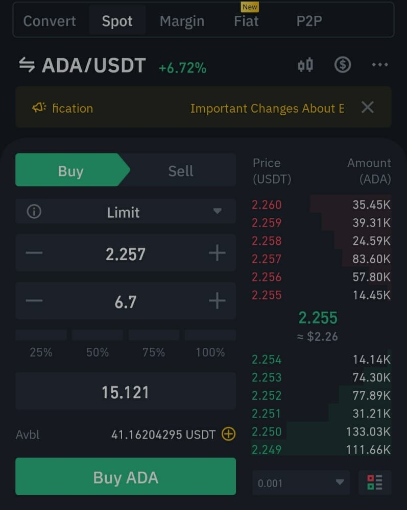 In order to purchase at least a 15$ equivalent of ADA, i made sure my account had more than $15