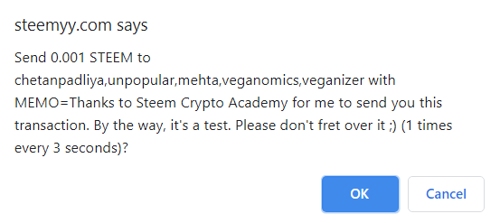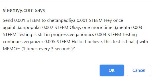 On clicking Send the window says to confirm sending 0.001 STEEM every 3 seconds. I said wtf! But re-verifying everything I assumed the interface messsages are buggy as before. So I clicked OK anyway.