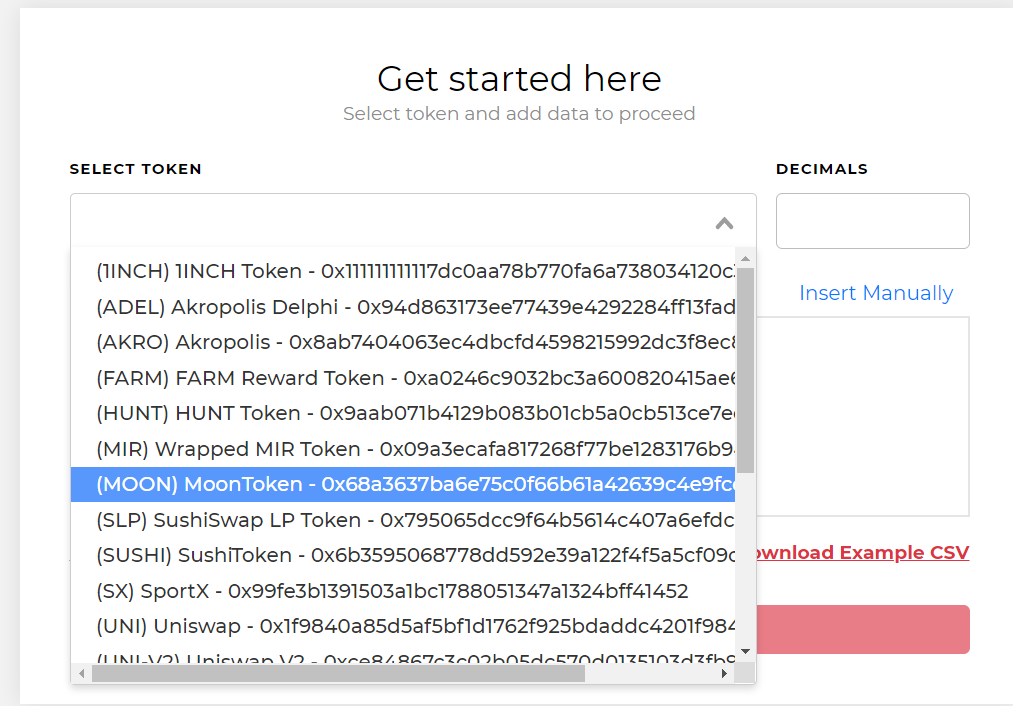 After selecting your token, you need to upload a CSV file for all the addresses you want to send those tokens to. It's a very simple CSV file with one address in each line. You can also instruct to send different amount to different addresses by specifying the amount followed by the address. Every address should be followed by a comma and then the no. of tokens you wish to send it to that address (Note, there is no space in between).