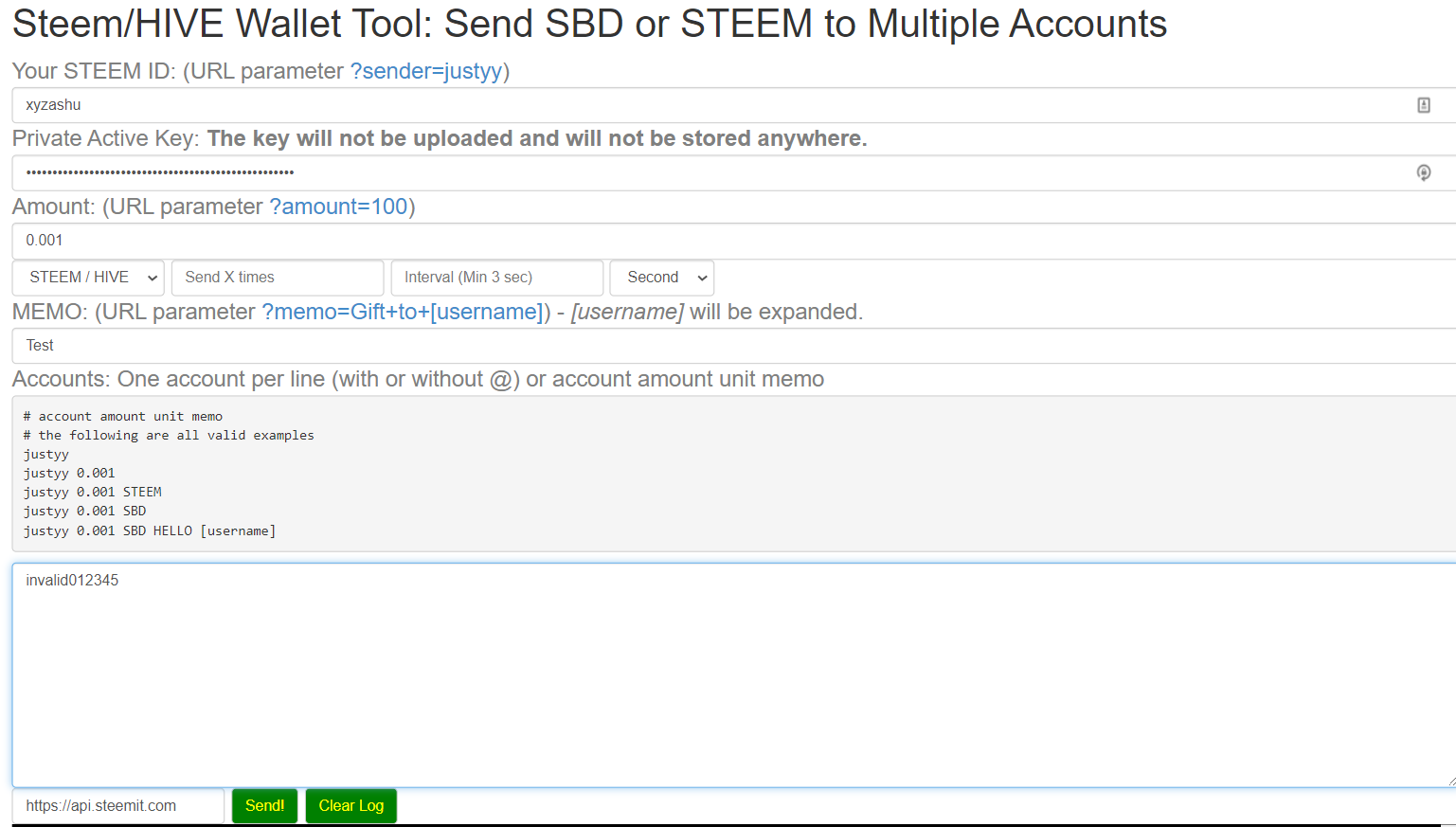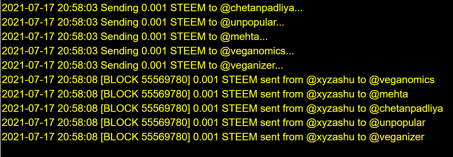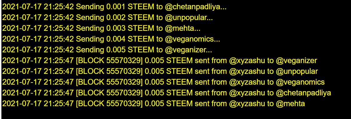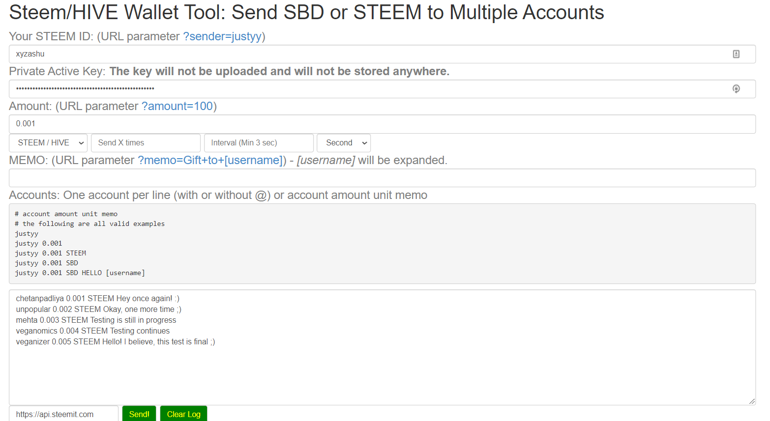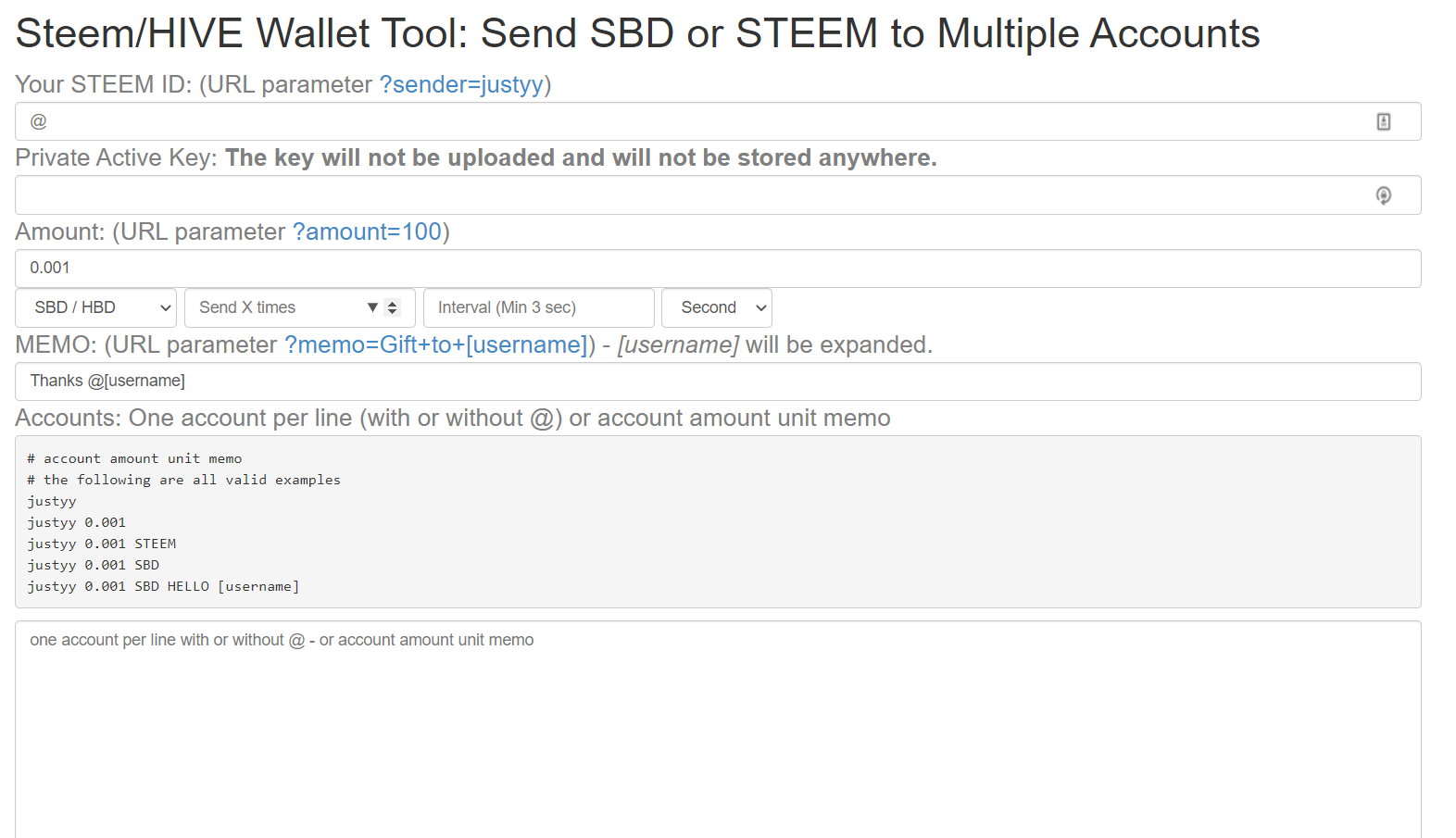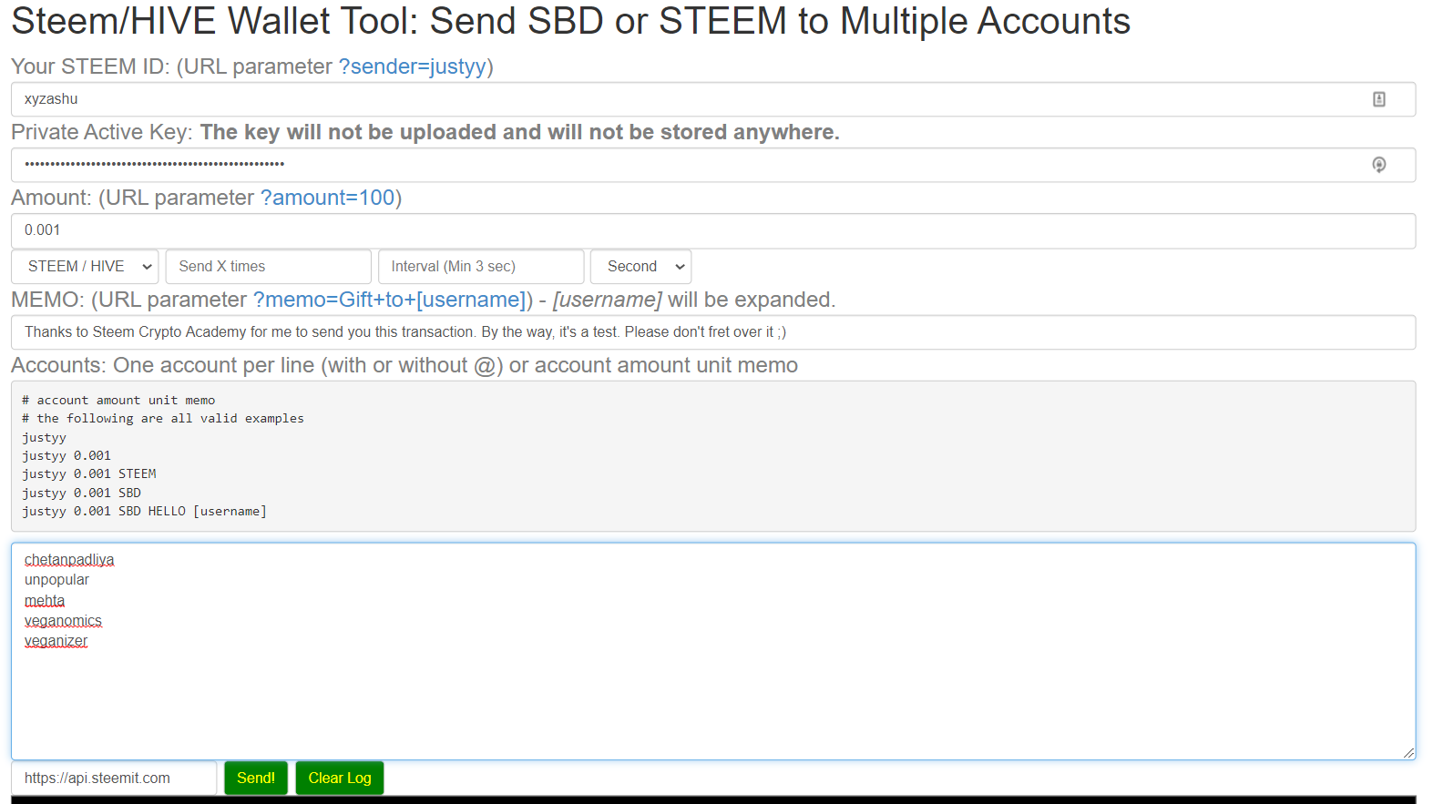 Note that here I have filled only the usernames in each line in the last text box. This is because I'm sending each of them the same amount with the same memo. And all these parameters can easily be set by filling in the above specified text boxes.