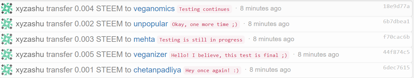 Guys, please don't trust what you're seeing here. This interface seems a little buggy. It's showing that I sent 0.005 STEEM to everyone when I didn't.