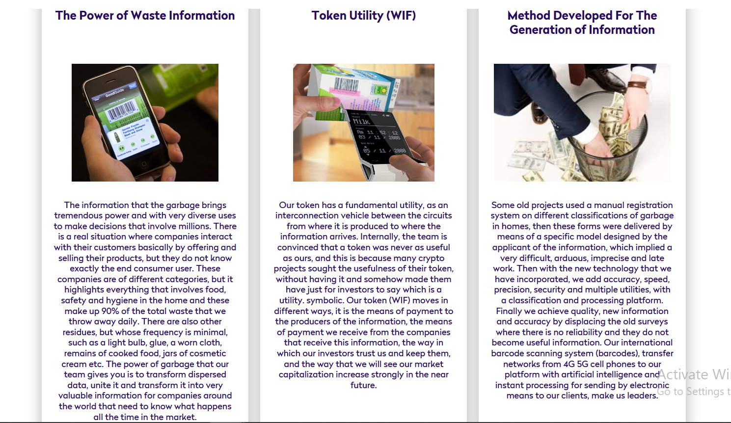WasteInfonet is the first company to use Artificial Intelligence, an Application for Android and IOS with a scanning device, data storage, a built-in multi-wallet and a central platform with a protocol that allows to achieve a total, secure and automated interconnection, with technologies designed in networks, allowing in this way to use all available technology and managing to generate and transfer information like we have never seen before. In each home located in a certain country, city or town, its owner will be able to scan the barcodes of each product that he discards daily, and through his mobile phone, store this information and transfer it to our platform, receiving a payment in WIF tokens (WASTEINFONET) for the work done. Later our platform will carry out the processing, classification, filtering systems and thus finally be able to concentrate all the data and send the extremely valuable information, so that companies can make decisions with greater profitability.
