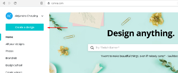 1 - Head over to https://canva.com (I suggest you sign up using your social network account of your preference so you can save your designs for later) and click on Create a design: