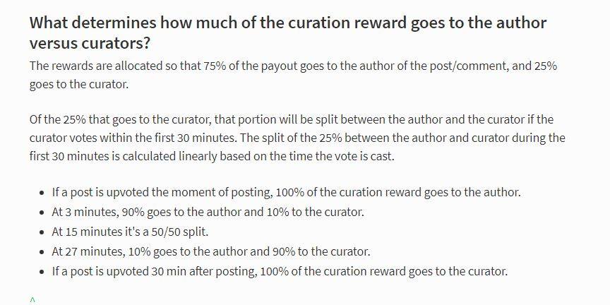ইমাম এসএমএন (রহ.) এর মতে পোস্টের মেয়াদের উপর ভিত্তি করে কিউরেশন রিওয়ার্ড প্রদান করা হয়। অর্থাৎ তিনি বলেন- কম বয়সী পোস্টে আপভোট প্রদান করলে কিউরেশন রিওয়ার্ড কম পাওয়া যায় এবং বয়স্ক পোস্টে আপভোট প্রদান করলে কিউরেশন রিওয়ার্ড বেশি অর্জিত হয়। তিনি প্রমাণ স্বরূপ স্টীমিটের FAQ থেকে নিম্নোক্ত স্ক্রীনশটটি প্রদান করেন।