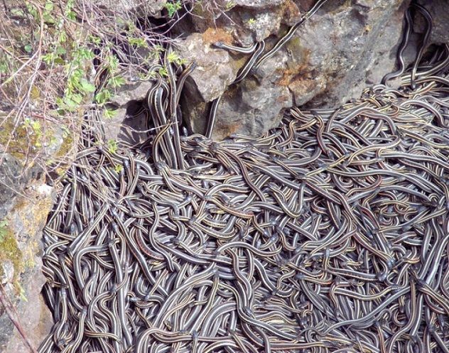 The large underground holes they use are called hibernacles and are sometimes big enough for hundreds of snakes to fit in. Imagine the scene in spring when the weather is warm enough and all the snakes slither out at the same time!