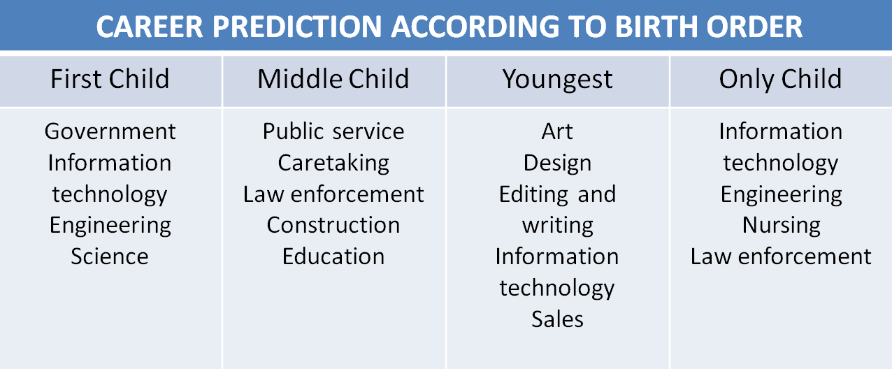 Now that you know about birth orders let's see what lies behind it when it comes to your future. Below are some samples and prediction were you can best fit base on your birth order and personality. See picture below.