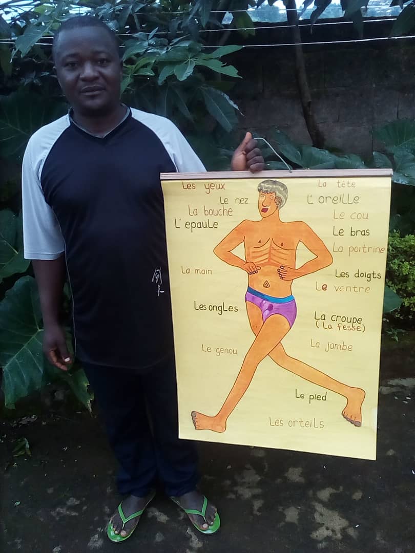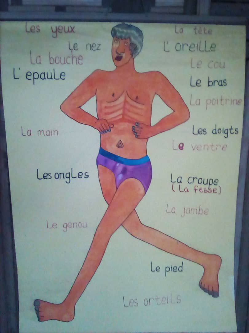 Below is a picture of a chart on parts of the body which I labeled in French though my official language is English language, So, i will be happy to learn from any part that may be poorly labeled or left out in the labeling.