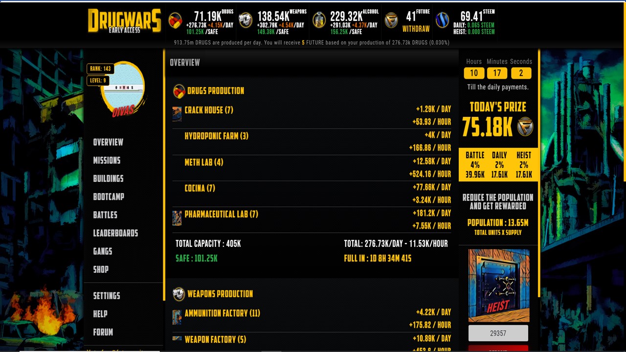 Since I love strategy games, I tried out Drugwars. I like the concept, and I have played enough of the game. The idea is to keep upgrading three resources, Drugs (being the most important), Alcohol and Weapons. The production of drugs allows you to get a portion of the daily rewards in Steem (in recent past this has been changed to Future Tokens). Also, if a player has excess drugs production, which he or she does not intend to use for upgrading their buildings, they can contribute towards the Heist and earn Steem from there too.