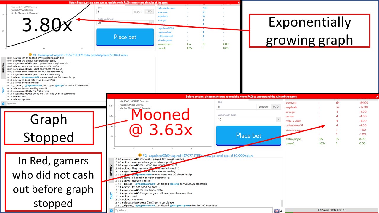 But here’s the tricky part, you as a player have to bet and keep watching a graph which grows exponentially. The idea is to “cash out” before the graph stops growing or in Moonsteem’s terminology – moons.