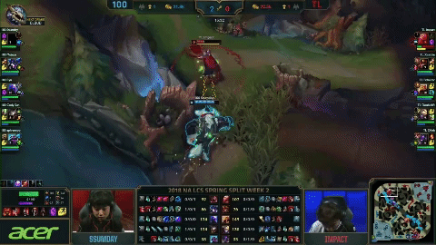 Another bought between two 2-0 teams coming out of Week 1. Personally, I'm a 100T fan and I'm honestly happy to be wrong with this prediction. I was pretty confident in TL's ability and thought that they would pull out a win over 100T. I was, however, quite wrong. 100T came out hard and just kept on hitting TL. Ryu did some work split pushing lanes and taking two inhib turrets himself, not to mention he basically deleted Doublelift any time he saw him. Ssumday had a pretty sweet kill on Impact with the well timed boomerang as Impact came out of stopwatch.