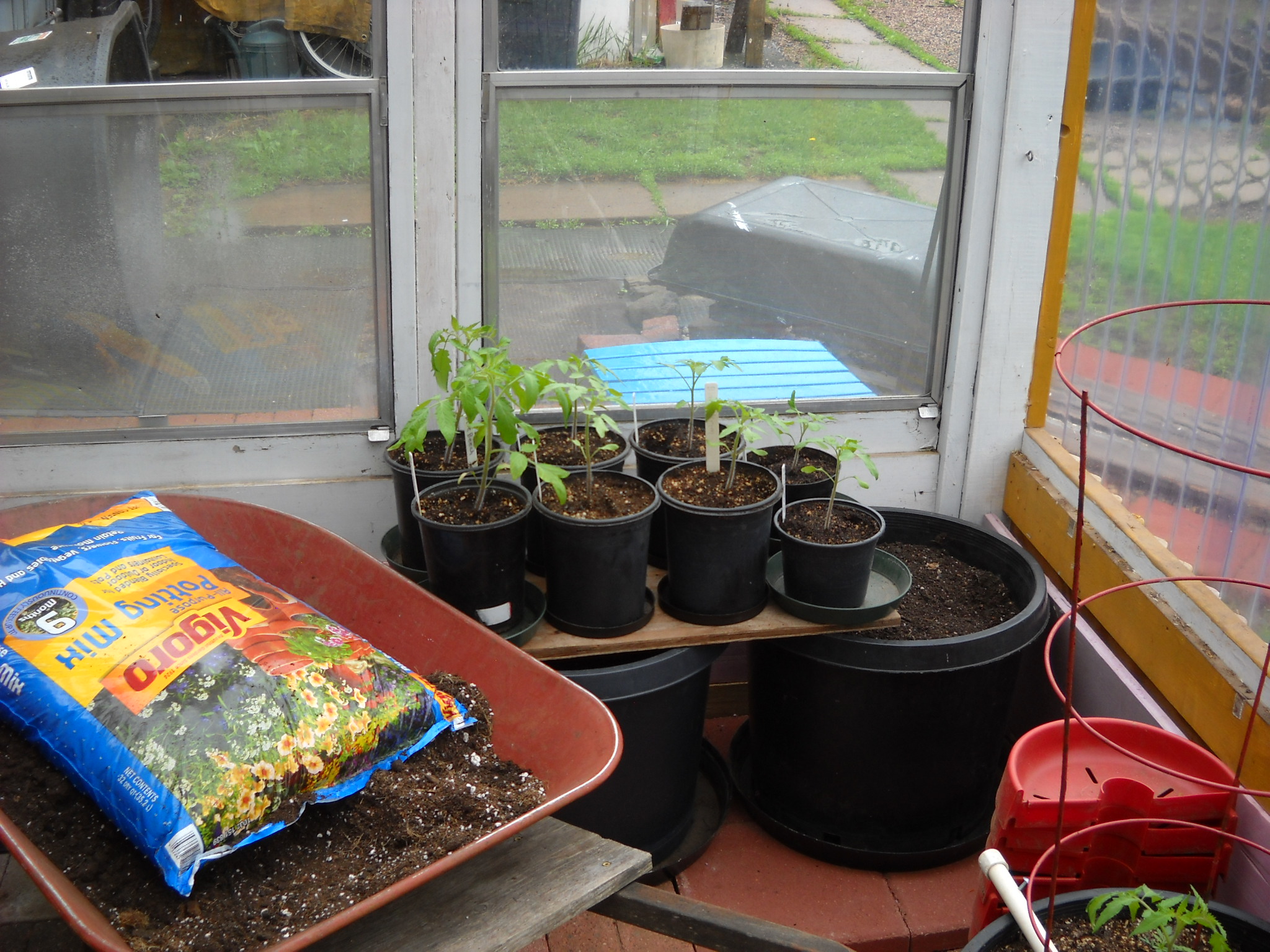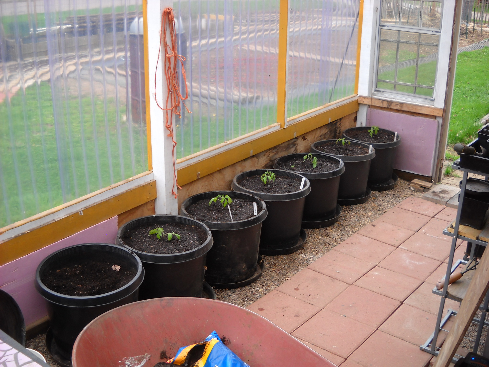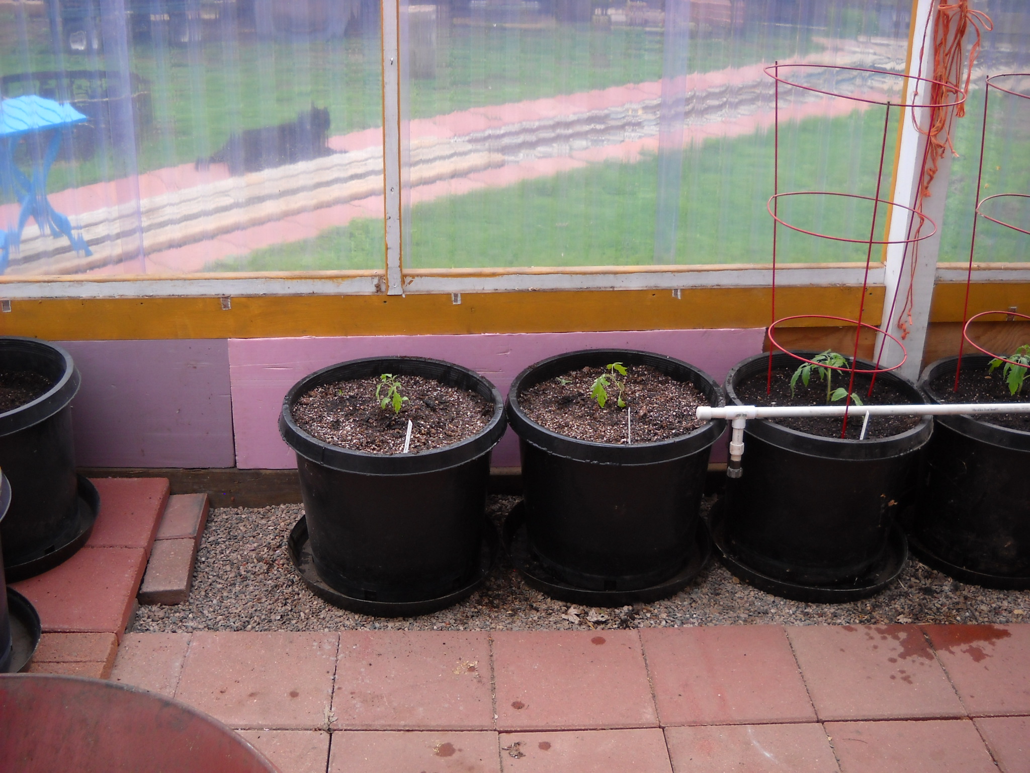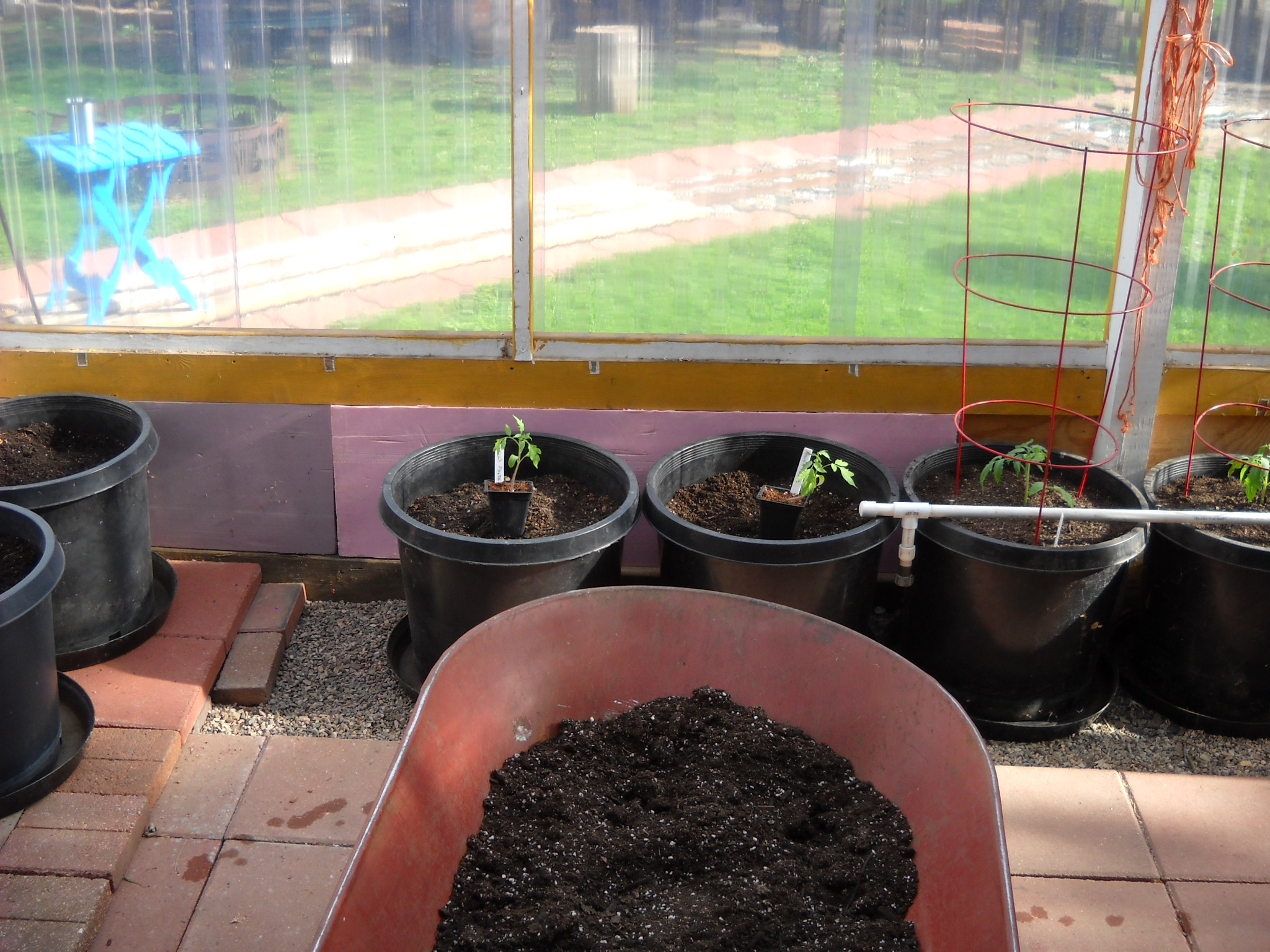 I was going to repot the larger tomato plants to give them more room for root growth, but I decided to just plant some of them into the big greenhouse pots where they'll be all summer.