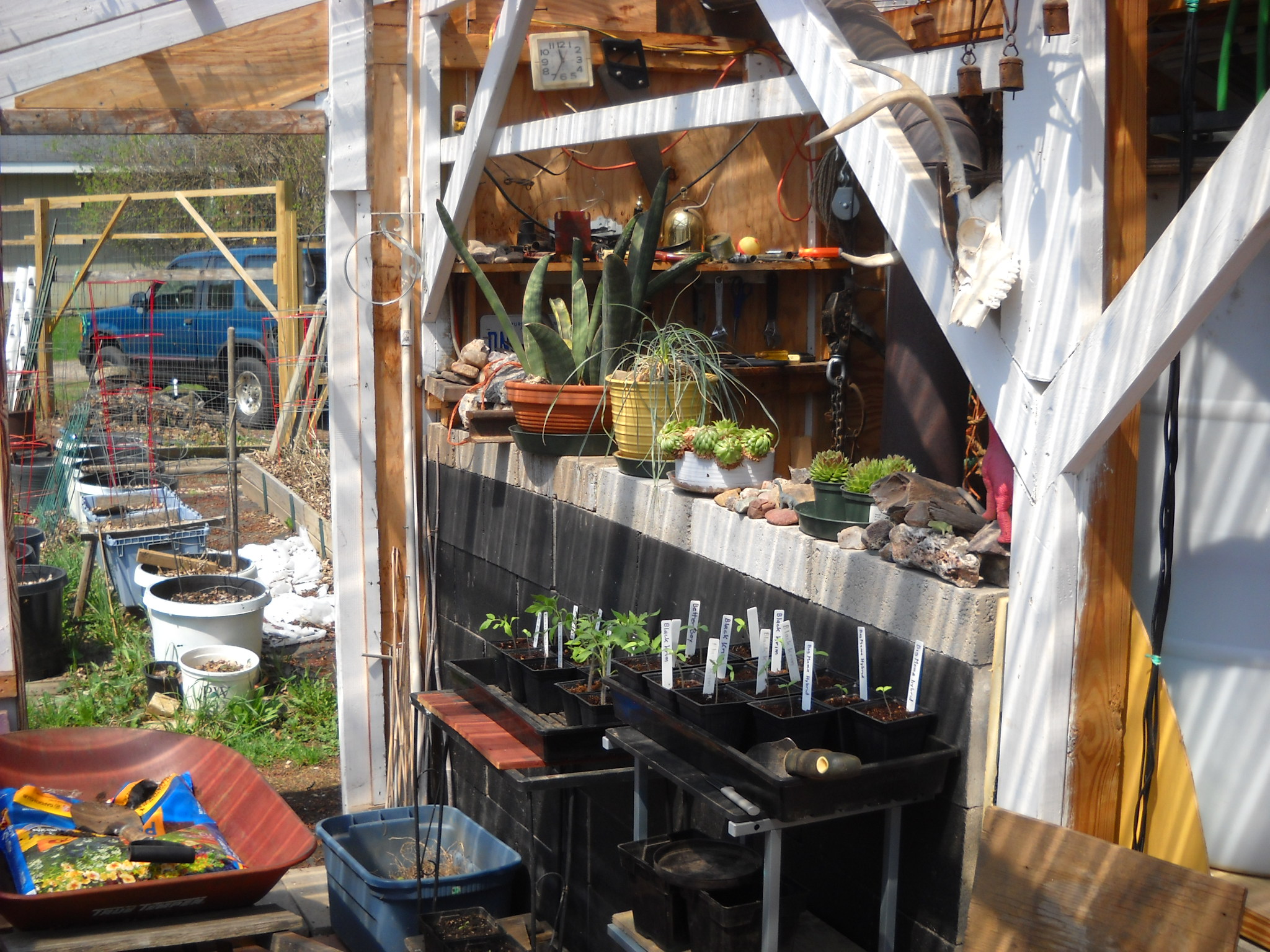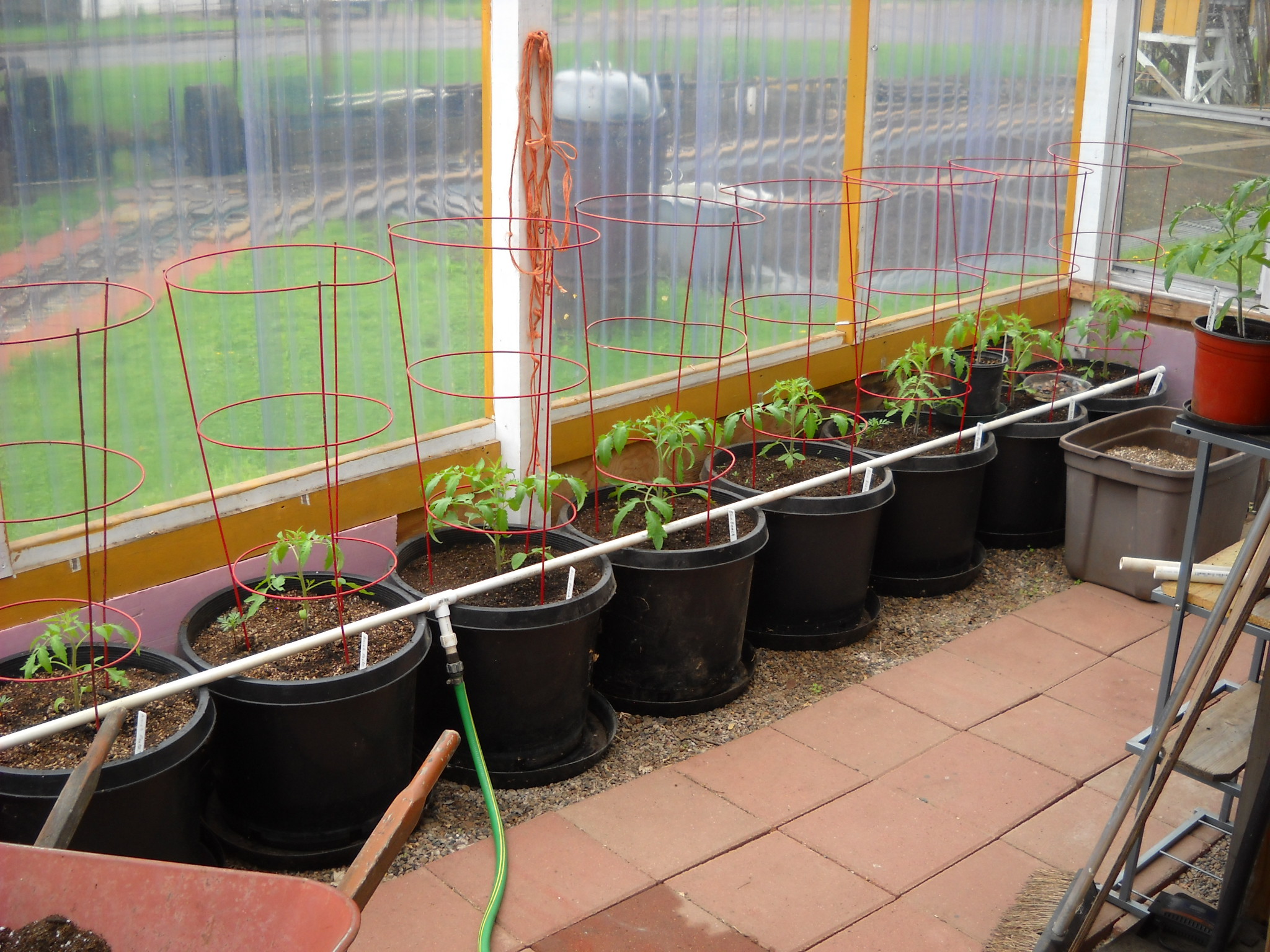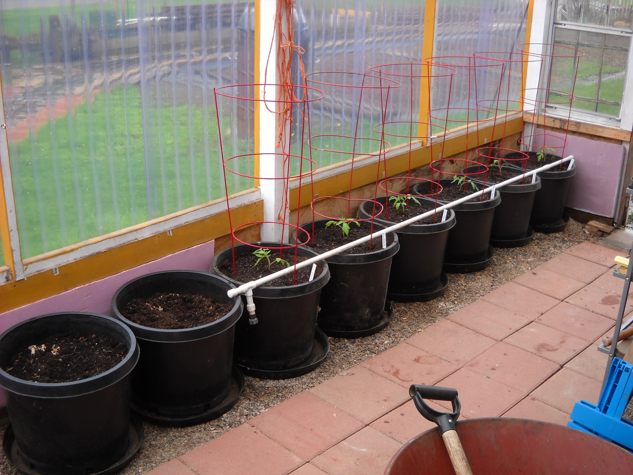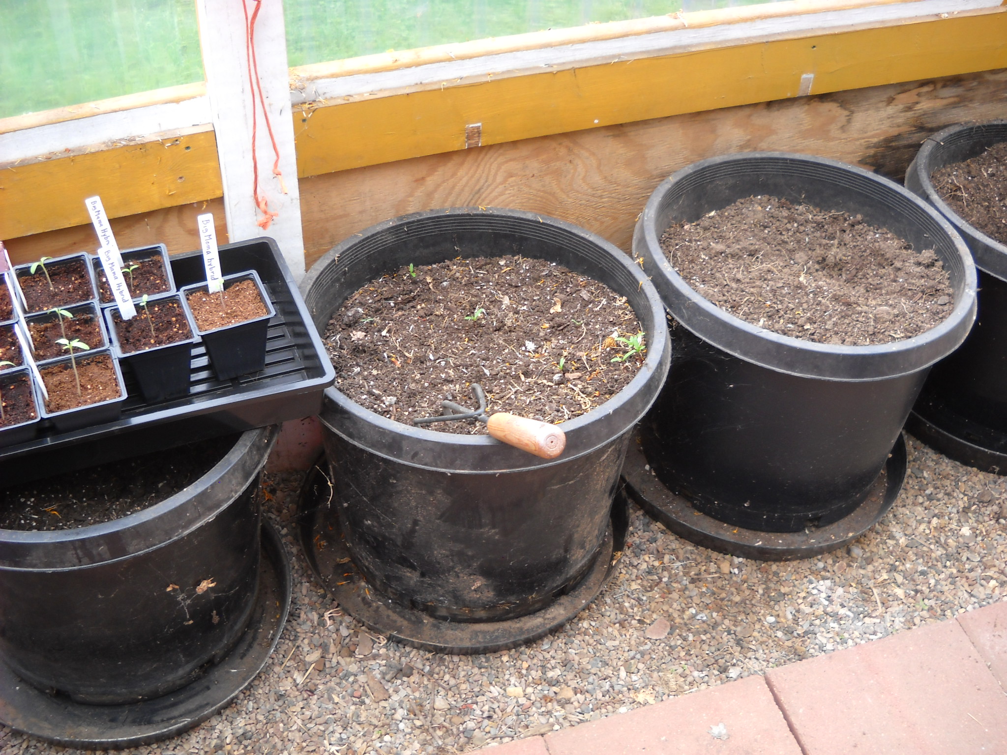 I was going to repot the larger tomato plants to give them more room for root growth, but I decided to just plant some of them into the big greenhouse pots where they'll be all summer.