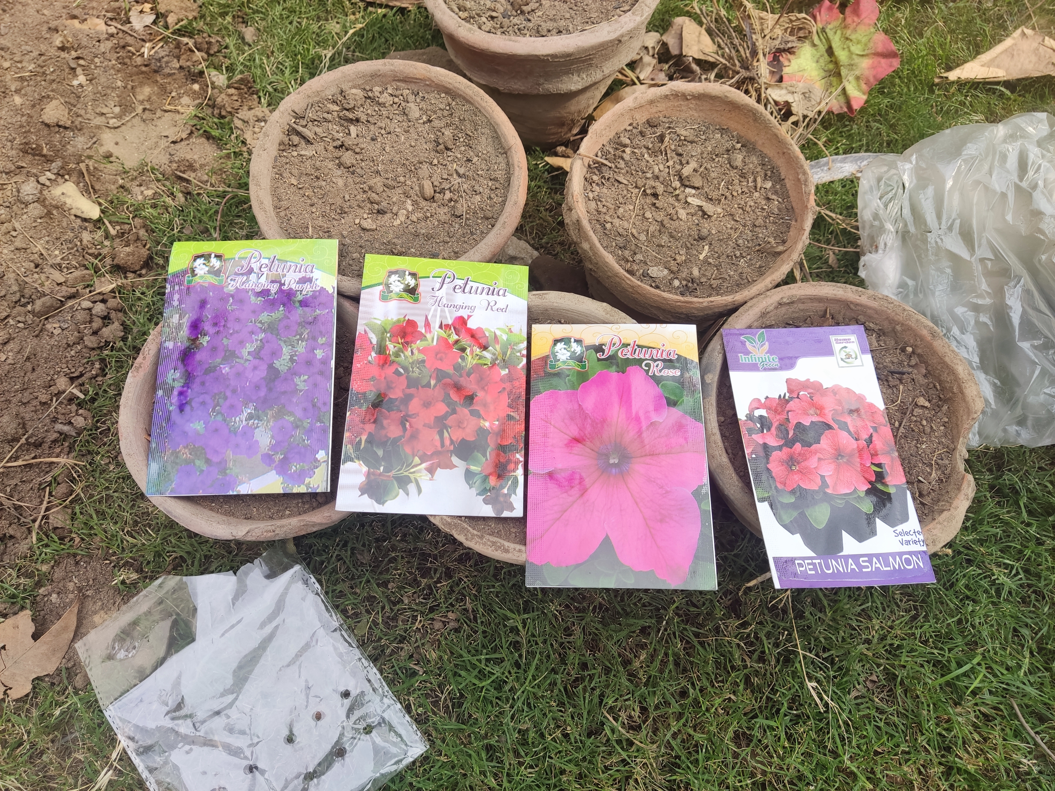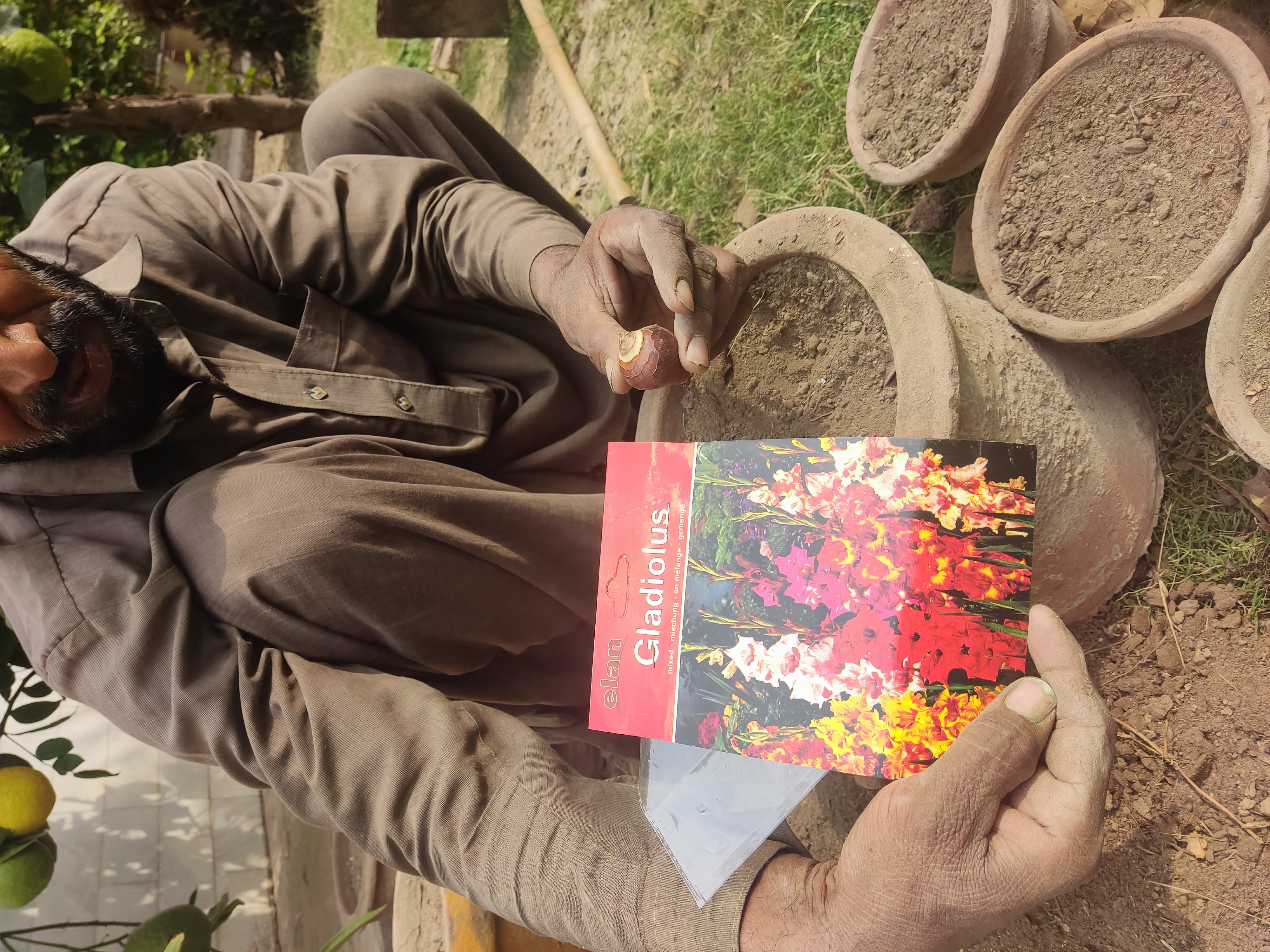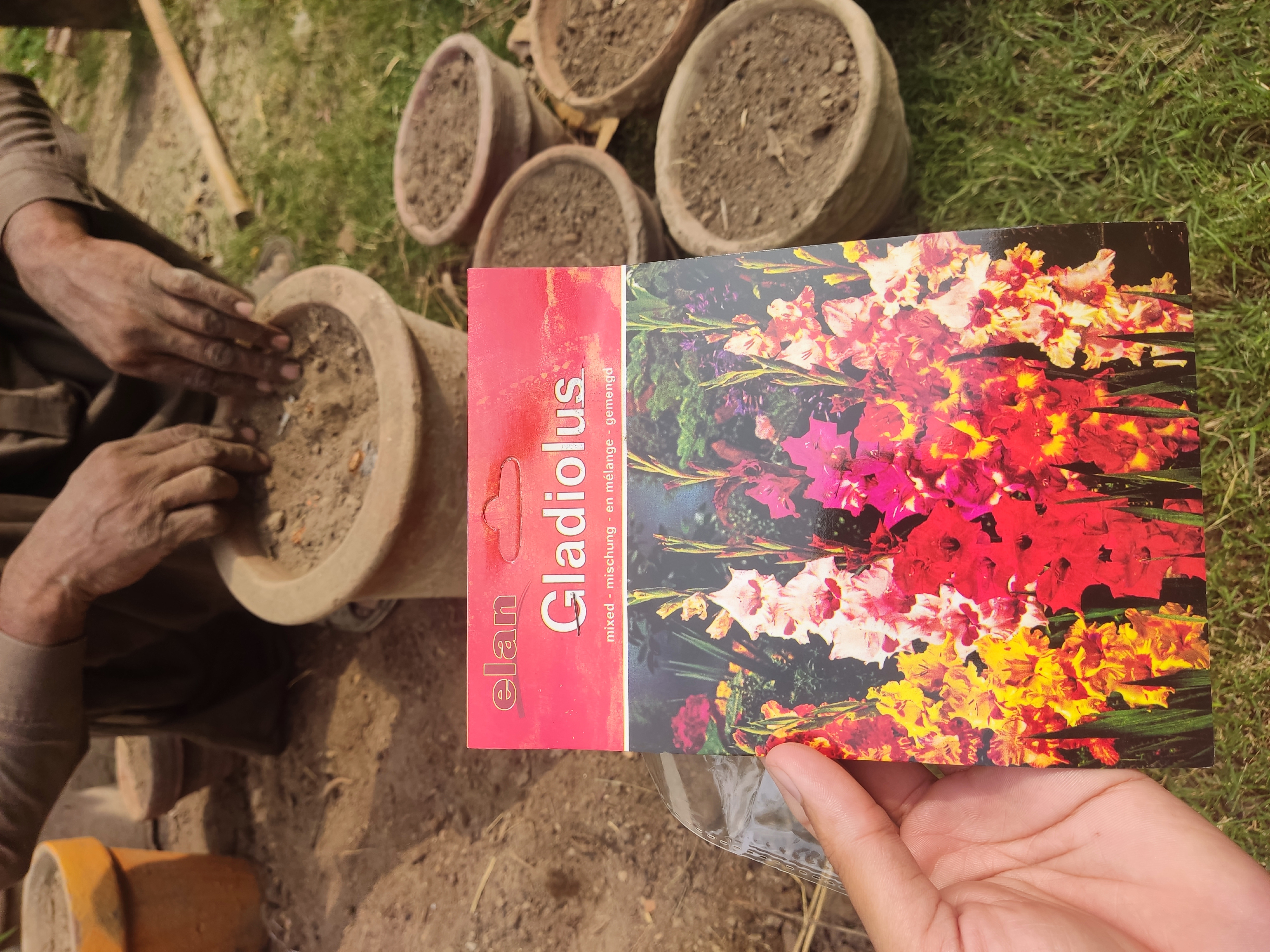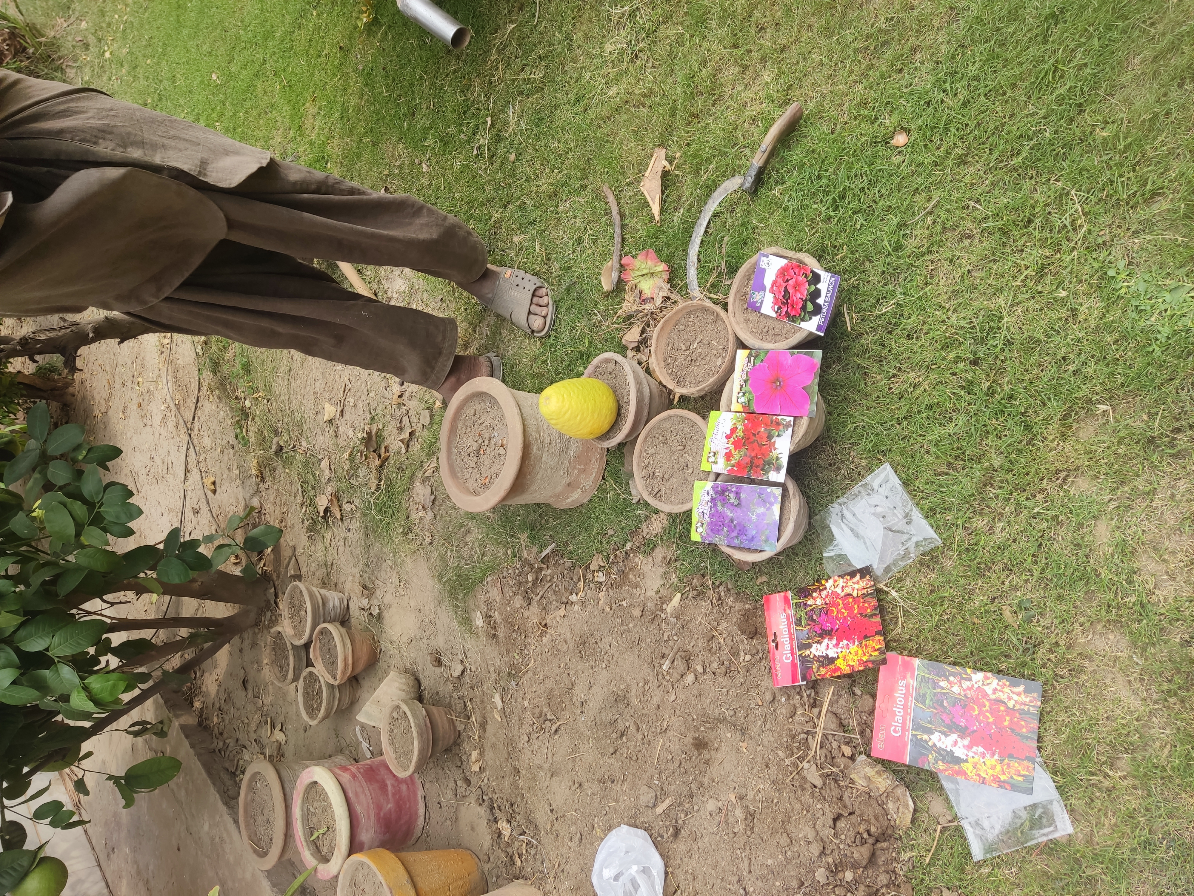 At first he got read the new mud with natural fertilizer and then he put the seends in it.