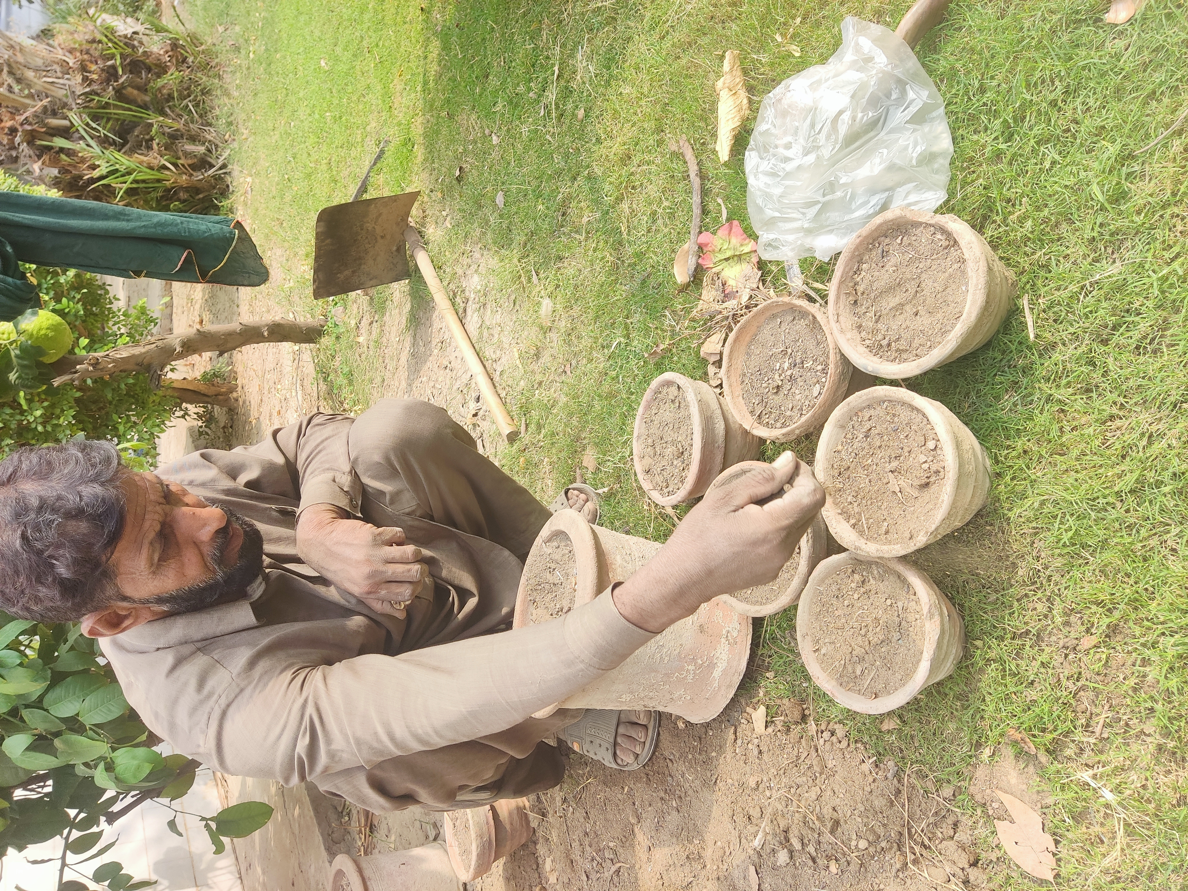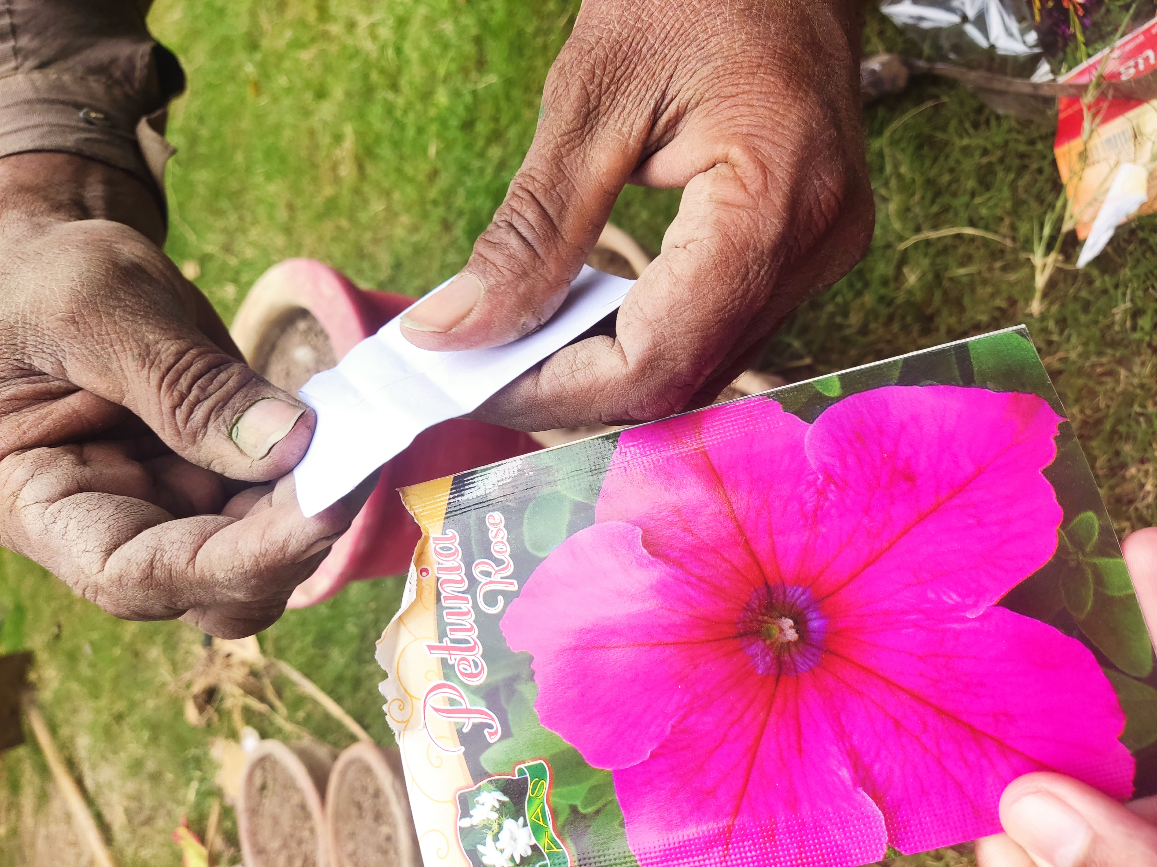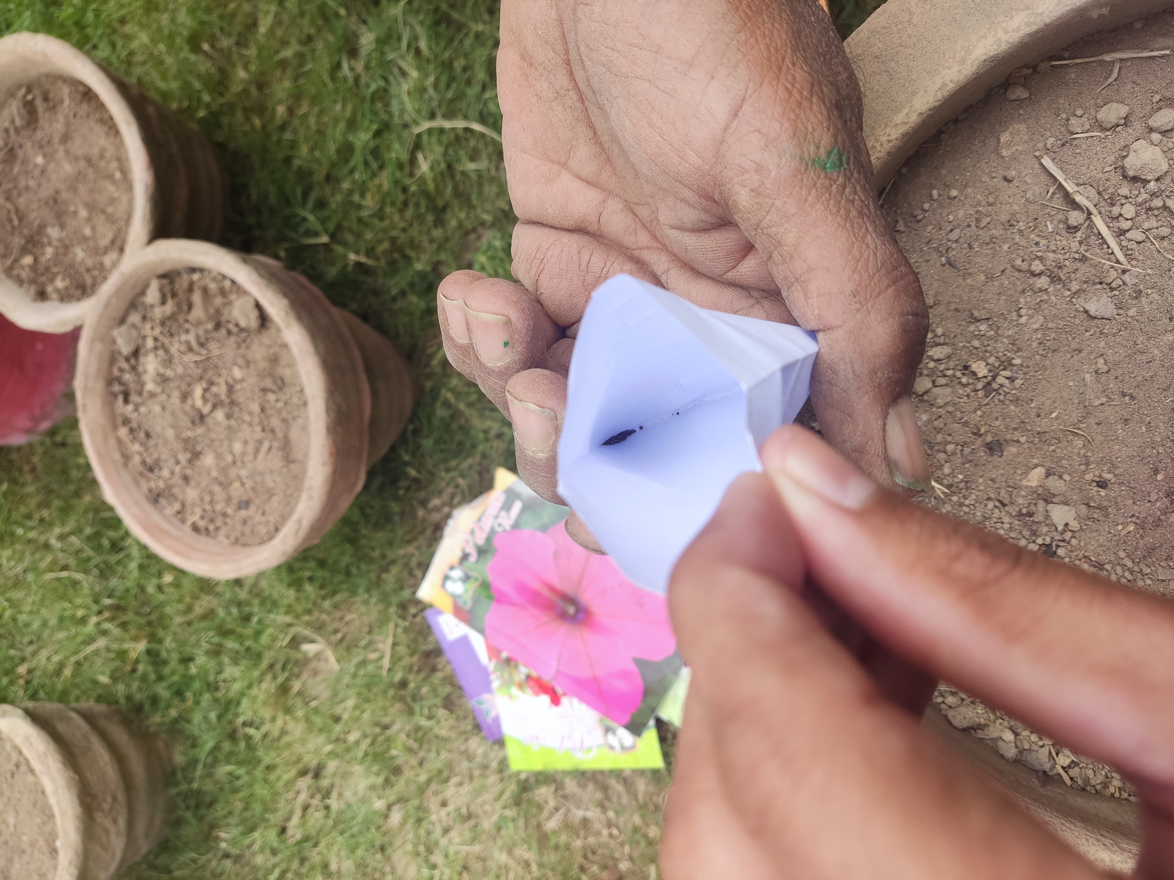 As shown in pic,their seed is so small and it is also costly so he is planting it very carefully.