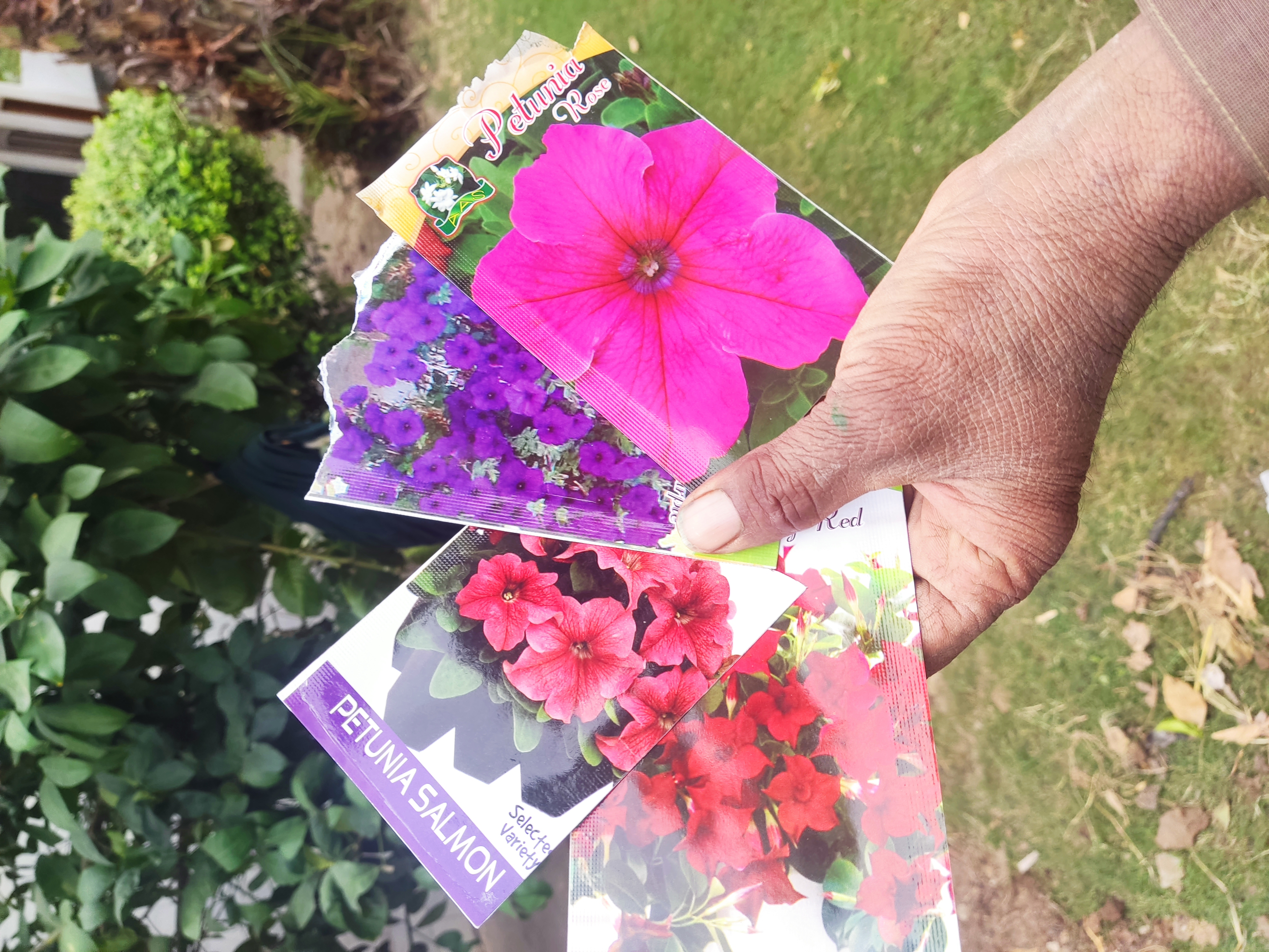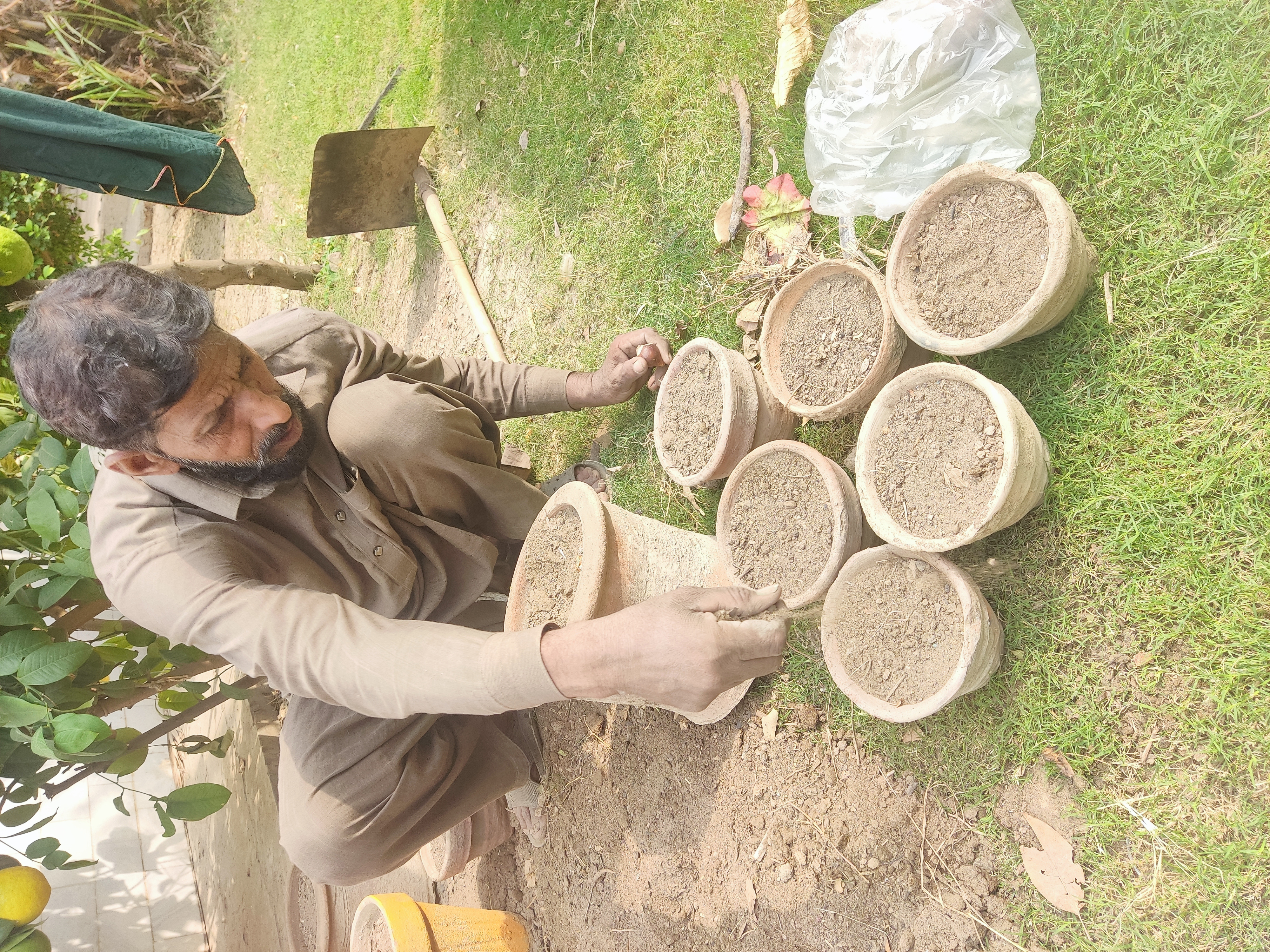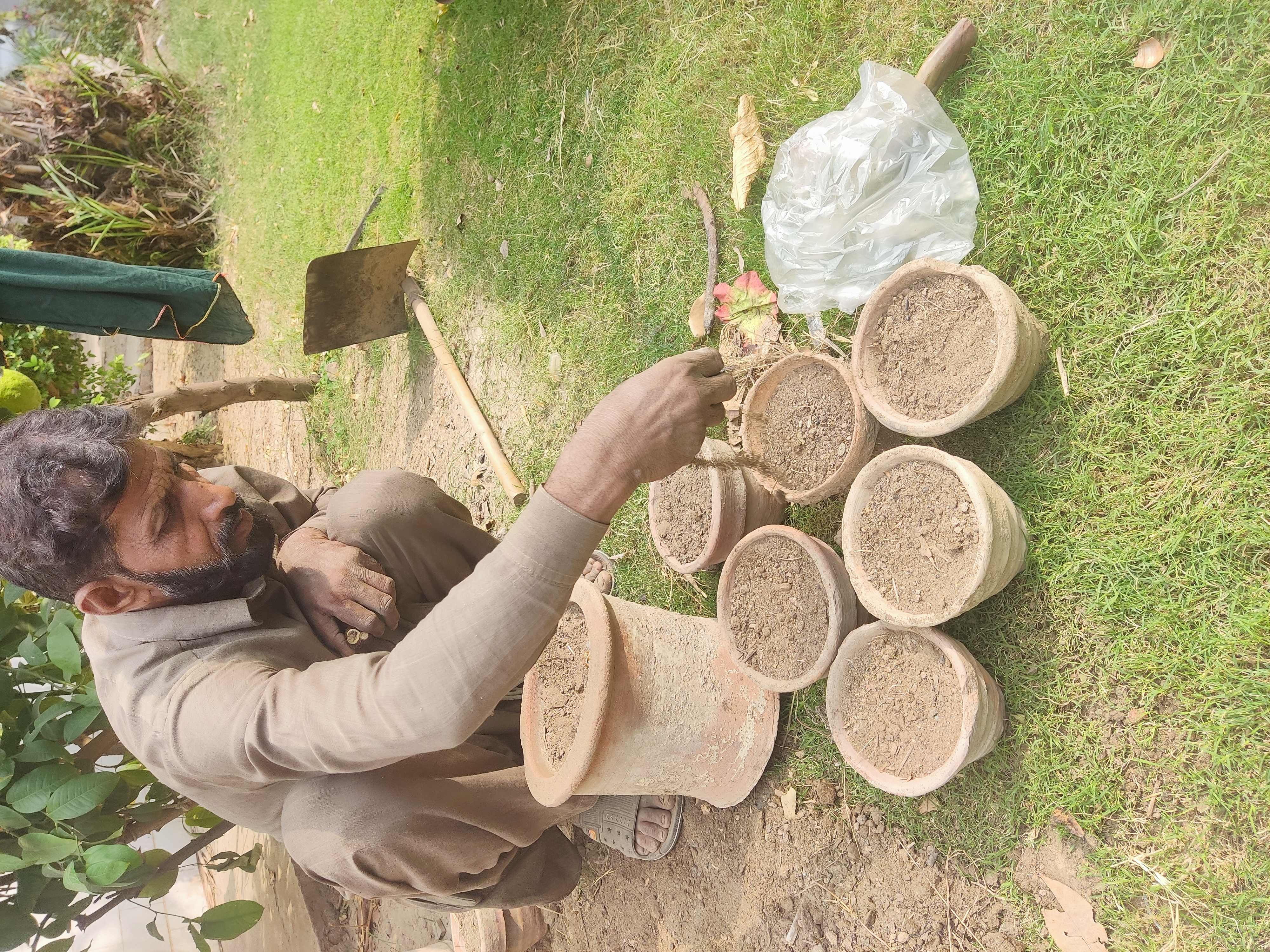 As shown in pic,their seed is so small and it is also costly so he is planting it very carefully.