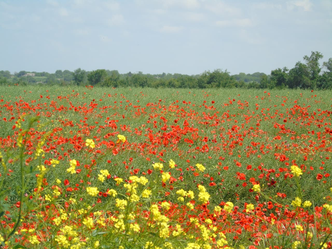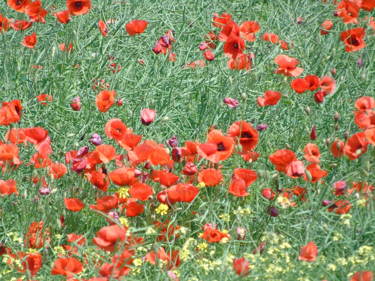 Особенно эффектно выглядят маковые поля, по которым ветер катит алые волны, или лужайки с полевыми цветами, где маки соседствуют с ромашками и лютиками.