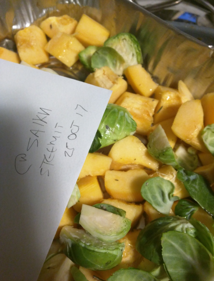 Peel that sucker and cube it. Quarter brussel sprouts. Toss all with seasoning of choice, oil and maple syrup, some butter on top for taste. Put in pan, cover and in the oven it goes. Set to default and forget about it for an hour.