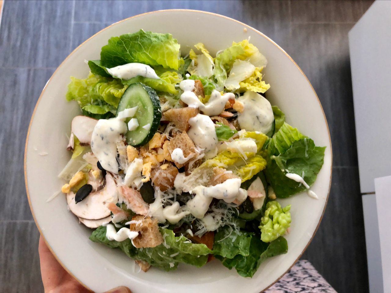 写真は私のではないです w お父ちゃんの大きなサンドイッチです。私はパンをもりもり食べる元気がなく、先週作ったパンの残りがあったので、同じような具材を使ってサラダにしました。