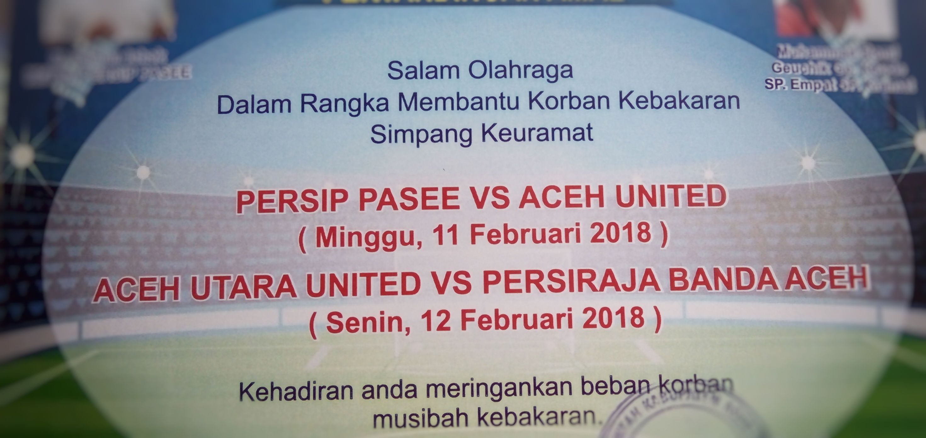 Yang terbaru, manajemen tim Persip Pasee dan pihak pemerintah desa Simpang Peut akan menggelar laga amal untuk membantu korban kebakaran. Laga yang mempertemukan Persip Pasee vs Aceh United akan dilangsungkan pada Minggu (besok) tanggal 11 Februari 2018, pukul 16.00 Waktu Indonesia Barat (WIB) di lapangan sepak bola Simpang Keuramat, Aceh Utara.