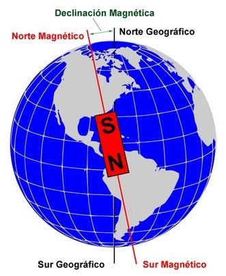 La declinación magnética es el ángulo comprendido entre el campo magnético local y el norte verdadero geográfico.